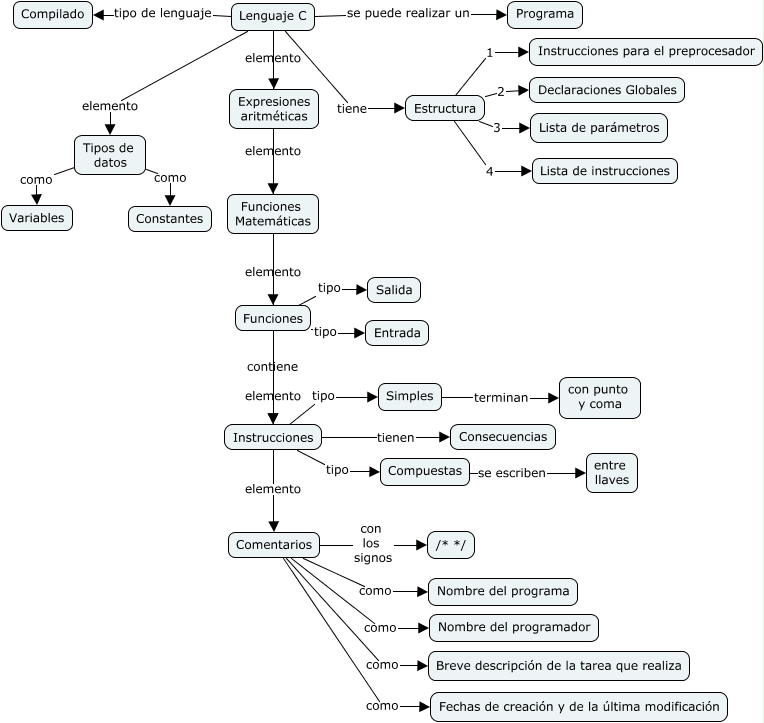 Este Cmap, tiene información relacionada con: Lenguaje C, Lenguaje C elemento Funciones, Comentarios como Nombre del programa, Instrucciones tipo Compuestas, Estructura 4 Lista de instrucciones, Funciones tipo Entrada, Comentarios como Fechas de creación y de la última modificación, Compuestas se escriben entre llaves, Lenguaje C elemento Instrucciones, Lenguaje C tiene Estructura, Funciones tipo Salida, Lenguaje C tipo de lenguaje Compilado, Lenguaje C elemento Comentarios, Lenguaje C se puede realizar un Programa, Instrucciones tipo Simples, Estructura 3 Lista de parámetros, Funciones contiene Instrucciones, Estructura 2 Declaraciones Globales, Simples terminan con punto y coma, Lenguaje C elemento Expresiones aritméticas, Instrucciones tienen Consecuencias