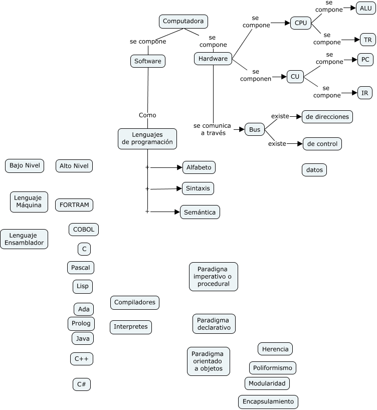 Este Cmap, tiene información relacionada con: ModVonNeumann, CPU se compone ALU, Software Como Lenguajes de programación, Hardware se comunica a través Bus, Computadora se compone Hardware, Bus existe de control, CU se compone PC, Lenguajes de programación + Semántica, Bus existe de direcciones, Lenguajes de programación + Alfabeto, CPU se compone TR, Hardware se componen CU, Lenguajes de programación + Sintaxis, Computadora se compone Software, Hardware se compone CPU, CU se compone IR