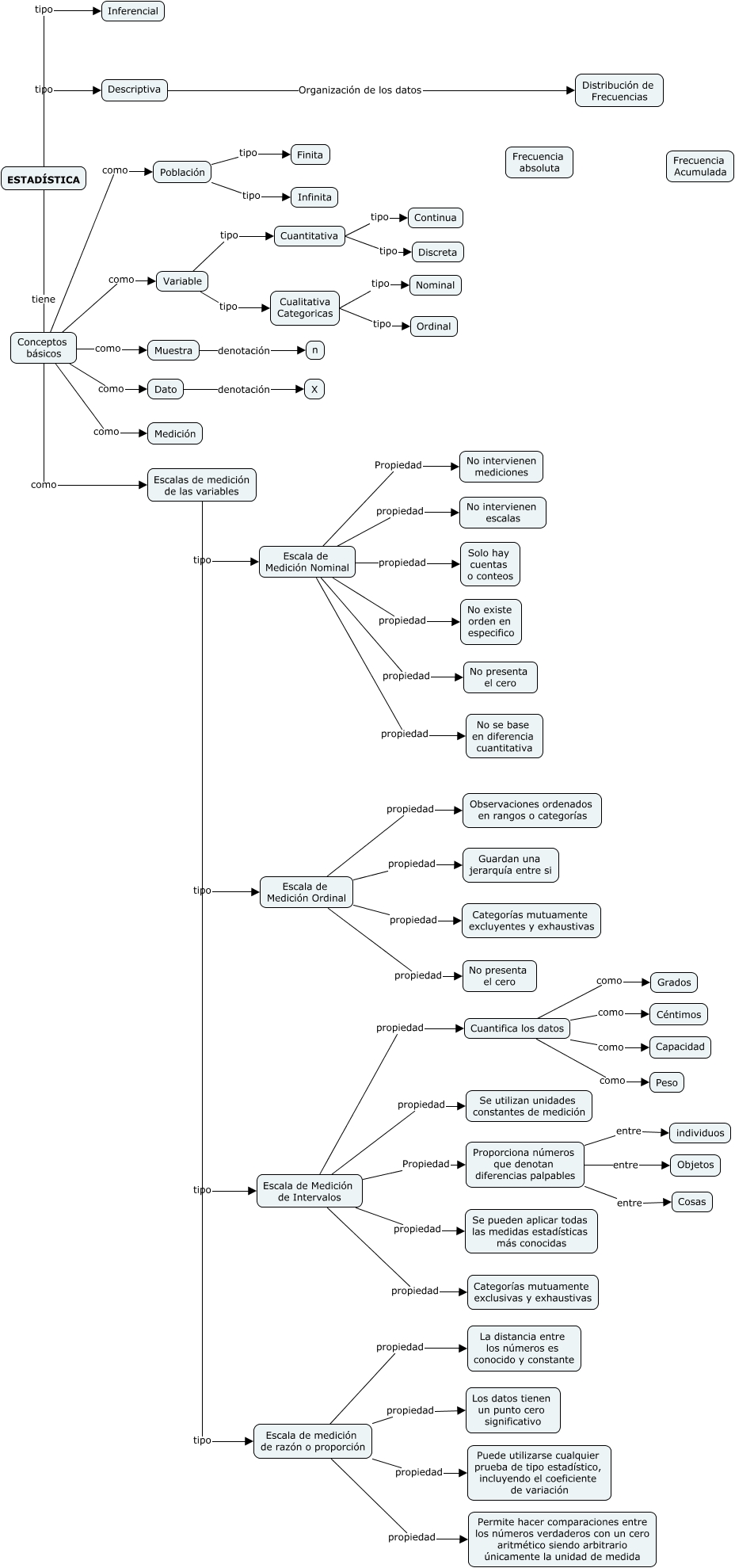 Este Cmap, tiene información relacionada con: U2Estadistica, Cuantifica los datos como Capacidad, Población tipo Finita, Escala de Medición Nominal propiedad No se base en diferencia cuantitativa, Escala de Medición Nominal Propiedad No intervienen mediciones, Población tipo Infinita, Dato denotación X, Escala de medición de razón o proporción propiedad Puede utilizarse cualquier prueba de tipo estadístico, incluyendo el coeficiente de variación, ESTADÍSTICA tipo Descriptiva, Cuantifica los datos como Peso, Escala de Medición de Intervalos propiedad Cuantifica los datos, Escala de Medición Nominal propiedad No presenta el cero, Cuantifica los datos como Céntimos, Variable tipo Cuantitativa, Conceptos básicos como Dato, Escala de Medición de Intervalos propiedad Se pueden aplicar todas las medidas estadísticas más conocidas, Conceptos básicos como Medición, Escala de medición de razón o proporción propiedad Permite hacer comparaciones entre los números verdaderos con un cero aritmético siendo arbitrario únicamente la unidad de medida, Cuantifica los datos como Grados, Escala de Medición Nominal propiedad No existe orden en especifico, Variable tipo Cualitativa Categoricas