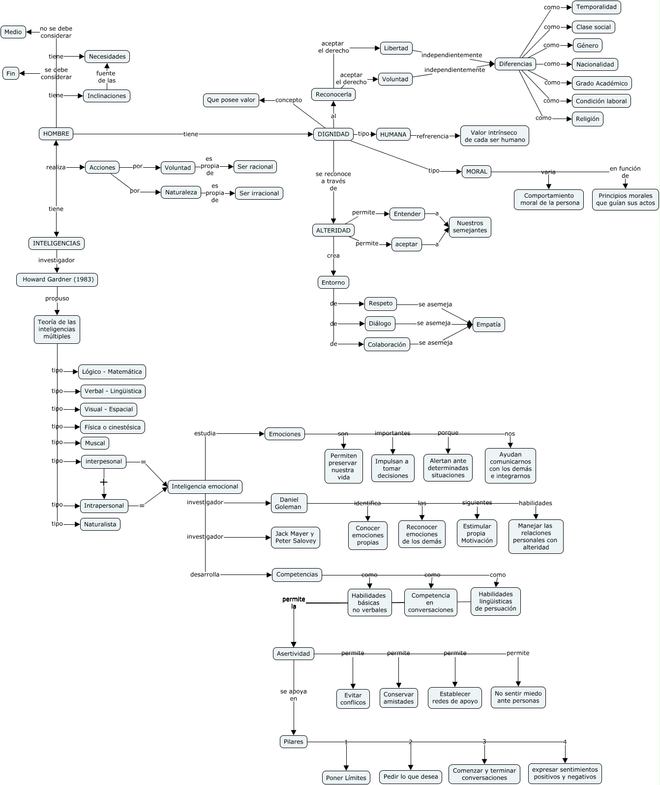 Este Cmap, tiene información relacionada con: U22, Diferencias como Condición laboral, Respeto se asemeja Empatía, DIGNIDAD concepto Que posee valor, Teoría de las inteligencias múltiples tipo Física o cinestésica, Entender a Nuestros semejantes, DIGNIDAD al Reconocerla, Teoría de las inteligencias múltiples tipo Verbal - Lingüistica, HOMBRE tiene Necesidades, MORAL varia Comportamiento moral de la persona, Inteligencia emocional desarrolla Competencias, Daniel Goleman las Reconocer emociones de los demás, Teoría de las inteligencias múltiples tipo Intrapersonal, Competencias como Habilidades básicas no verbales, Asertividad permite Establecer redes de apoyo, Emociones porque Alertan ante determinadas situaciones, Pilares 3 Comenzar y terminar conversaciones, interpesonal = Inteligencia emocional, Competencias como Habilidades lingüisticas de persuación, Competencia en conversaciones permite la Asertividad, Howard Gardner (1983) propuso Teoría de las inteligencias múltiples