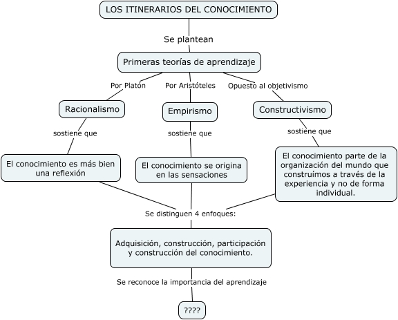 Este Cmap, tiene información relacionada con: Capitulo 2 Yessica Gutierrez, Empirismo sostiene que El conocimiento se origina en las sensaciones, Adquisición, construcción, participación y construcción del conocimiento. Se reconoce la importancia del aprendizaje ????, LOS ITINERARIOS DEL CONOCIMIENTO Se plantean Primeras teorías de aprendizaje, El conocimiento parte de la organización del mundo que construímos a través de la experiencia y no de forma individual. Se distinguen 4 enfoques: Adquisición, construcción, participación y construcción del conocimiento., Constructivismo sostiene que El conocimiento parte de la organización del mundo que construímos a través de la experiencia y no de forma individual., El conocimiento se origina en las sensaciones Se distinguen 4 enfoques: Adquisición, construcción, participación y construcción del conocimiento., Primeras teorías de aprendizaje Por Aristóteles Empirismo, Primeras teorías de aprendizaje Por Platón Racionalismo, Primeras teorías de aprendizaje Opuesto al objetivismo Constructivismo, El conocimiento es más bien una reflexión Se distinguen 4 enfoques: Adquisición, construcción, participación y construcción del conocimiento., Racionalismo sostiene que El conocimiento es más bien una reflexión