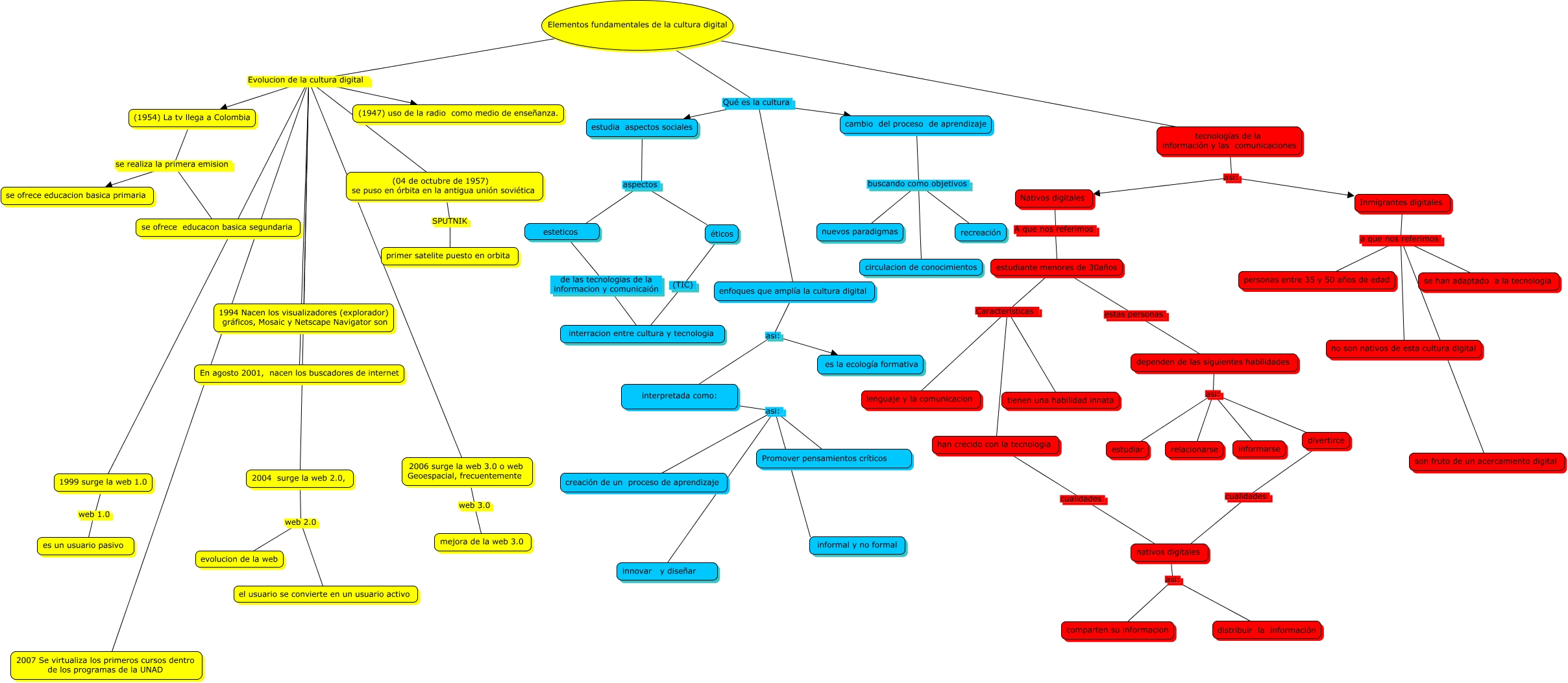 Este Cmap, tiene información relacionada con: RAMIREZ BETANCOURT, Elementos fundamentales de la cultura digital Evolucion de la cultura digital (1947) uso de la radio como medio de enseñanza., Elementos fundamentales de la cultura digital Evolucion de la cultura digital (1954) La tv llega a Colombia, enfoques que amplía la cultura digital asi: interpretada como:, Elementos fundamentales de la cultura digital Evolucion de la cultura digital 2004 surge la web 2.0,, interpretada como: asi: informal y no formal, interpretada como: asi: Promover pensamientos críticos, Elementos fundamentales de la cultura digital Evolucion de la cultura digital 2007 Se virtualiza los primeros cursos dentro de los programas de la UNAD, cambio del proceso de aprendizaje buscando como objetivos nuevos paradigmas, (1954) La tv llega a Colombia se realiza la primera emision se ofrece educacon basica segundaria, enfoques que amplía la cultura digital asi: es la ecología formativa, nativos digitales asi: distribuir la información, Inmigrantes digitales a que nos referimos no son nativos de esta cultura digital, Elementos fundamentales de la cultura digital Qué es la cultura estudia aspectos sociales, estudiante menores de 30años Características tienen una habilidad innata, Elementos fundamentales de la cultura digital Evolucion de la cultura digital (04 de octubre de 1957) se puso en órbita en la antigua unión soviética, cambio del proceso de aprendizaje buscando como objetivos recreación, 2006 surge la web 3.0 o web Geoespacial, frecuentemente web 3.0 mejora de la web 3.0, dependen de las siguientes habilidades asi: divertirce, tecnologías de la información y las comunicaciones asi: Inmigrantes digitales, esteticos de las tecnologias de la informacion y comunicaión interracion entre cultura y tecnologia