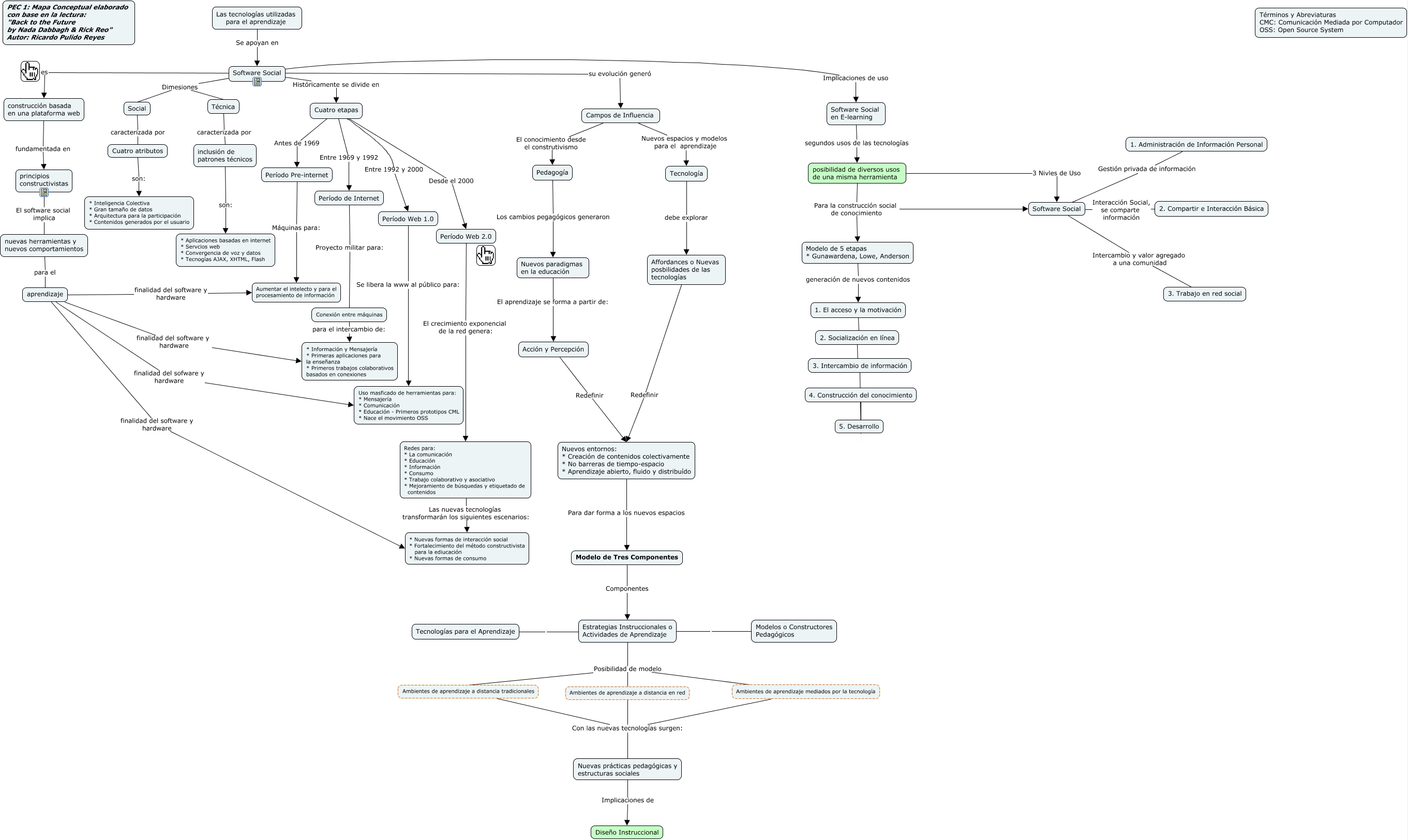 Este Cmap, tiene información relacionada con: PEC 1 BACK TO THE FUTURE Tecnologías aplicadas al aprendizaje, inclusión de patrones técnicos son: * Aplicaciones basadas en internet * Servcios web * Convergencia de voz y datos * Tecnogías AJAX, XHTML, Flash, Acción y Percepción Redefinir Nuevos entornos: * Creación de contenidos colectivamente * No barreras de tiempo-espacio * Aprendizaje abierto, fluido y distribuído, Software Social Históricamente se divide en Cuatro etapas, Período Web 2.0 El crecimiento exponencial de la red genera: Redes para: * La comunicación * Educación * Información * Consumo * Trabajo colaborativo y asociativo * Mejoramiento de búsquedas y etiquetado de contenidos, posibilidad de diversos usos de una misma herramienta Para la construcción social de conocimiento Software Social, Software Social Dimesiones Técnica, Nuevos paradigmas en la educación El aprendizaje se forma a partir de: Acción y Percepción, Cuatro etapas Entre 1969 y 1992 Período de Internet, Campos de Influencia El conocimiento desde el construtivismo Pedagogía, Cuatro etapas Antes de 1969 Período Pre-internet, Social caracterizada por Cuatro atributos, Ambientes de aprendizaje a distancia en red Con las nuevas tecnologías surgen: Ambientes de aprendizaje a distancia tradicionales, Estrategias Instruccionales o Actividades de Aprendizaje Modelos o Constructores Pedagógicos, Técnica caracterizada por inclusión de patrones técnicos, Modelo de 5 etapas * Gunawardena, Lowe, Anderson generación de nuevos contenidos 1. El acceso y la motivación, Nuevos entornos: * Creación de contenidos colectivamente * No barreras de tiempo-espacio * Aprendizaje abierto, fluido y distribuído Para dar forma a los nuevos espacios Modelo de Tres Componentes, Ambientes de aprendizaje a distancia en red Con las nuevas tecnologías surgen: Ambientes de aprendizaje mediados por la tecnología, nuevas herramientas y nuevos comportamientos para el aprendizaje, Redes para: * La comunicación * Educación * Información * Consumo * Trabajo colaborativo y asociativo * Mejoramiento de búsquedas y etiquetado de contenidos Las nuevas tecnologías transformarán los siguientes escenarios: * Nuevas formas de interacción social * Fortalecimiento del método constructivista para la ediucación * Nuevas formas de consumo, posibilidad de diversos usos de una misma herramienta Para la construcción social de conocimiento Modelo de 5 etapas * Gunawardena, Lowe, Anderson