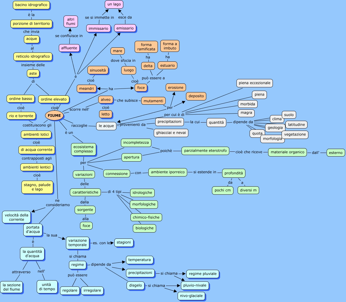 Questa Cmap, creata con IHMC CmapTools, contiene informazioni relative a: Il fiume, affluente se confluisce in altri fiumi, ecosistema complesso per variazioni, regime può essere irregolare, le acque per cui è di morbida, ecosistema complesso per incompletezza, bacino idrografico è la porzione di territorio, caratteristiche dalla sorgente, la quantità d'acqua attraverso la sezione del fiume, profondità a diversi m, luogo dove sfocia in mare, le acque per cui è di magra, incompletezza poichè parzialmente eterotrofo, FIUME è immissario, FIUME costituiscono gli ambienti lotici, ambiente iporreico si estende in profondità, apertura poichè parzialmente eterotrofo, ordine basso cioè rio e torrente, le acque per cui è di piena, caratteristiche di 4 tipi idrologiche, le acque provenienti da precipitazioni