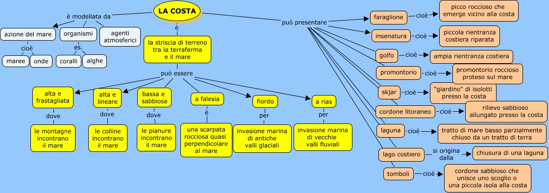 Questa Cmap, creata con IHMC CmapTools, contiene informazioni relative a: La costa, LA COSTA è la striscia di terreno tra la terraferma e il mare, la striscia di terreno tra la terraferma e il mare può essere bassa e sabbiosa, tomboli cioè cordone sabbioso che unisce uno scoglio o una piccola isola alla costa, la striscia di terreno tra la terraferma e il mare può essere a falesia, LA COSTA può presentare insenatura, azione del mare cioè maree, faraglione cioè picco roccioso che emerge vicino alla costa, LA COSTA è modellata da azione del mare, a rias per invasione marina di vecchie valli fluviali, LA COSTA può presentare cordone litoraneo, bassa e sabbiosa dove le pianure incontrano il mare, LA COSTA può presentare skjar, LA COSTA può presentare laguna, LA COSTA è modellata da agenti atmosferici, la striscia di terreno tra la terraferma e il mare può essere a rias, organismi es. coralli, laguna cioè tratto di mare basso parzialmente chiuso da un tratto di terra, lago costiero si origina dalla chiusura di una laguna, la striscia di terreno tra la terraferma e il mare può essere fiordo, LA COSTA può presentare promontorio