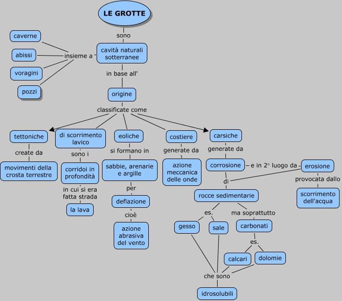 Questa Cmap, creata con IHMC CmapTools, contiene informazioni relative a: Grotte - Classificazione in base alla formazione, di scorrimento lavico sono i corridoi in profondità, deflazione cioè azione abrasiva del vento, origine classificate come di scorrimento lavico, carsiche generate da corrosione, erosione provocata dallo scorrimento dell'acqua, carbonati es. calcari, calcari che sono idrosolubili, cavità naturali sotterranee in base all' origine, dolomie che sono idrosolubili, corridoi in profondità in cui si era fatta strada la lava, LE GROTTE sono cavità naturali sotterranee, origine classificate come carsiche, sale che sono idrosolubili, origine classificate come eoliche, cavità naturali sotterranee insieme a pozzi, corrosione e in 2° luogo da erosione, tettoniche create da movimenti della crosta terrestre, cavità naturali sotterranee insieme a abissi, cavità naturali sotterranee insieme a voragini, rocce sedimentarie es. sale