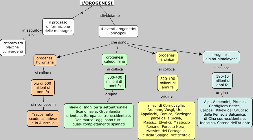 Questa Cmap, creata con IHMC CmapTools, contiene informazioni relative a: Orogenesi, 4 eventi orogenetici principali che sono orogenesi caledoniana, 4 eventi orogenetici principali che sono orogenesi alpino-himalayana, 4 eventi orogenetici principali che sono orogenesi huroniana, L'OROGENESI è il processo di formazione delle montagne, 180-10 milioni di anni fa origina Alpi, Appennini, Pirenei, Cordigliera Betica, Carpazi, Rilievi del Caucaso, della Penisola Balcanica, di Cina sud-occidentale, Indocina, Catena dell'Atlante, il processo di formazione delle montagne in seguito allo scontro tra placche convergenti, orogenesi alpino-himalayana si colloca 180-10 milioni di anni fa, orogenesi caledoniana si colloca 500-400 milioni di anni fa, 4 eventi orogenetici principali che sono orogenesi ercinica, orogenesi huroniana si colloca più di 600 milioni di anni fa, più di 600 milioni di anni fa si riconosce in Tracce nello scudo canadese e in Australia, orogenesi ercinica si colloca 320-190 milioni di anni fa, 320-190 milioni di anni fa origina rilievi di Cornovaglia, Ardenne, Vosgi, Urali, Appalachi, Corsica, Sardegna, parte della Sicilia, Massicci Elvetici, Massiccio Renano, Foresta Nera, Massicci del Portogallo e della Spagna occidentale, 500-400 milioni di anni fa origina rilievi di Inghilterra settentrionale, Scandinavia, Groenlandia orientale, Europa centro-occidentale, Danimarca: oggi sono tutti quasi completamente spianati, L'OROGENESI individuiamo 4 eventi orogenetici principali