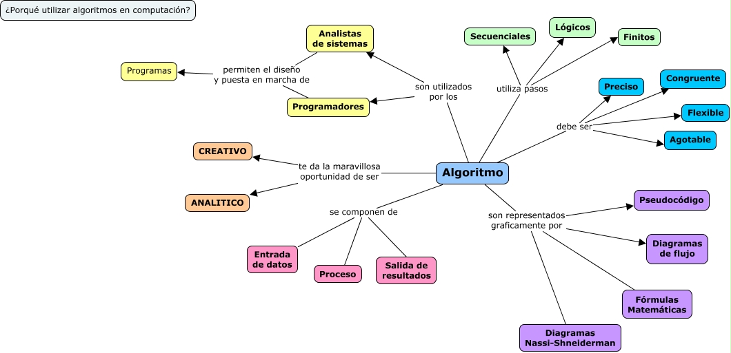 Este Cmap, tiene información relacionada con: Algortimo, Algoritmo son representados graficamente por Fórmulas Matemáticas, Algoritmo debe ser Congruente, Algoritmo utiliza pasos Finitos, Algoritmo utiliza pasos Lógicos, Algoritmo debe ser Preciso, Algoritmo debe ser Agotable, Algoritmo son utilizados por los Analistas de sistemas, Algoritmo te da la maravillosa oportunidad de ser CREATIVO, Algoritmo se componen de Salida de resultados, Algoritmo debe ser Flexible, Algoritmo son utilizados por los Programadores, Algoritmo son representados graficamente por Pseudocódigo, Algoritmo son representados graficamente por Diagramas Nassi-Shneiderman, Analistas de sistemas permiten el diseño y puesta en marcha de Programas, Algoritmo se componen de Proceso, Algoritmo son representados graficamente por Diagramas de flujo, Algoritmo utiliza pasos Secuenciales, Algoritmo te da la maravillosa oportunidad de ser ANALITICO, Algoritmo se componen de Entrada de datos, Programadores permiten el diseño y puesta en marcha de Programas