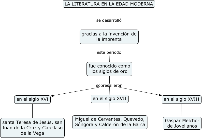 Este Cmap, tiene información relacionada con: La literatura en la Edad Moderna, en el siglo XVIII Gaspar Melchor de Jovellanos, en el siglo XVI santa Teresa de Jesús, san Juan de la Cruz y Garcilaso de la Vega, LA LITERATURA EN LA EDAD MODERNA se desarrolló gracias a la invención de la imprenta, fue conocido como los siglos de oro sobresalieron en el siglo XVIII, gracias a la invención de la imprenta este periodo fue conocido como los siglos de oro, fue conocido como los siglos de oro sobresalieron en el siglo XVI, fue conocido como los siglos de oro sobresalieron en el siglo XVII, en el siglo XVII Miguel de Cervantes, Quevedo, Góngora y Calderón de la Barca