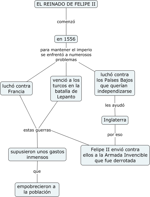 Este Cmap, tiene información relacionada con: El reinado de Felipe II, luchó contra Francia estas guerras supusieron unos gastos inmensos, en 1556 para mantener el imperio se enfrentó a numerosos problemas luchó contra Francia, venció a los turcos en la batalla de Lepanto estas guerras supusieron unos gastos inmensos, supusieron unos gastos inmensos que empobrecieron a la población, en 1556 para mantener el imperio se enfrentó a numerosos problemas venció a los turcos en la batalla de Lepanto, Inglaterra por eso Felipe II envió contra ellos a la Armada Invencible que fue derrotada, en 1556 para mantener el imperio se enfrentó a numerosos problemas luchó contra los Países Bajos que querían independizarse, Felipe II envió contra ellos a la Armada Invencible que fue derrotada estas guerras supusieron unos gastos inmensos, luchó contra los Países Bajos que querían independizarse les ayudó Inglaterra, EL REINADO DE FELIPE II comenzó en 1556