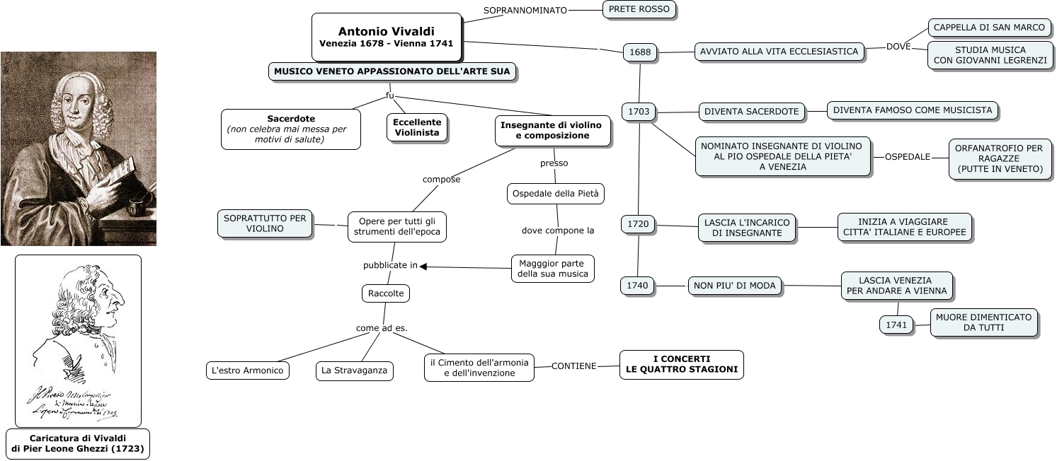 Questa Cmap, creata con IHMC CmapTools, contiene informazioni relative a: L15 Antonio Vivaldi, NON PIU' DI MODA ???? LASCIA VENEZIA PER ANDARE A VIENNA, DIVENTA SACERDOTE ???? DIVENTA FAMOSO COME MUSICISTA, il Cimento dell'armonia e dell'invenzione CONTIENE I CONCERTI LE QUATTRO STAGIONI, 1688 ???? 1703, 1740 NON PIU' DI MODA, LASCIA L'INCARICO DI INSEGNANTE ???? INIZIA A VIAGGIARE CITTA' ITALIANE E EUROPEE, AVVIATO ALLA VITA ECCLESIASTICA DOVE CAPPELLA DI SAN MARCO, AVVIATO ALLA VITA ECCLESIASTICA DOVE STUDIA MUSICA CON GIOVANNI LEGRENZI, 1703 ???? NOMINATO INSEGNANTE DI VIOLINO AL PIO OSPEDALE DELLA PIETA' A VENEZIA, Antonio Vivaldi Venezia 1678 - Vienna 1741 SOPRANNOMINATO PRETE ROSSO, 1720 ???? 1740, Antonio Vivaldi Venezia 1678 - Vienna 1741 fu Sacerdote (non celebra mai messa per motivi di salute), Raccolte come ad es. il Cimento dell'armonia e dell'invenzione, Magggior parte della sua musica pubblicate in Raccolte, 1741 ???? MUORE DIMENTICATO DA TUTTI, 1703 ???? DIVENTA SACERDOTE, Insegnante di violino e composizione presso Ospedale della Pietà, Opere per tutti gli strumenti dell'epoca SOPRATTUTTO PER VIOLINO, Insegnante di violino e composizione compose Opere per tutti gli strumenti dell'epoca, Raccolte come ad es. La Stravaganza