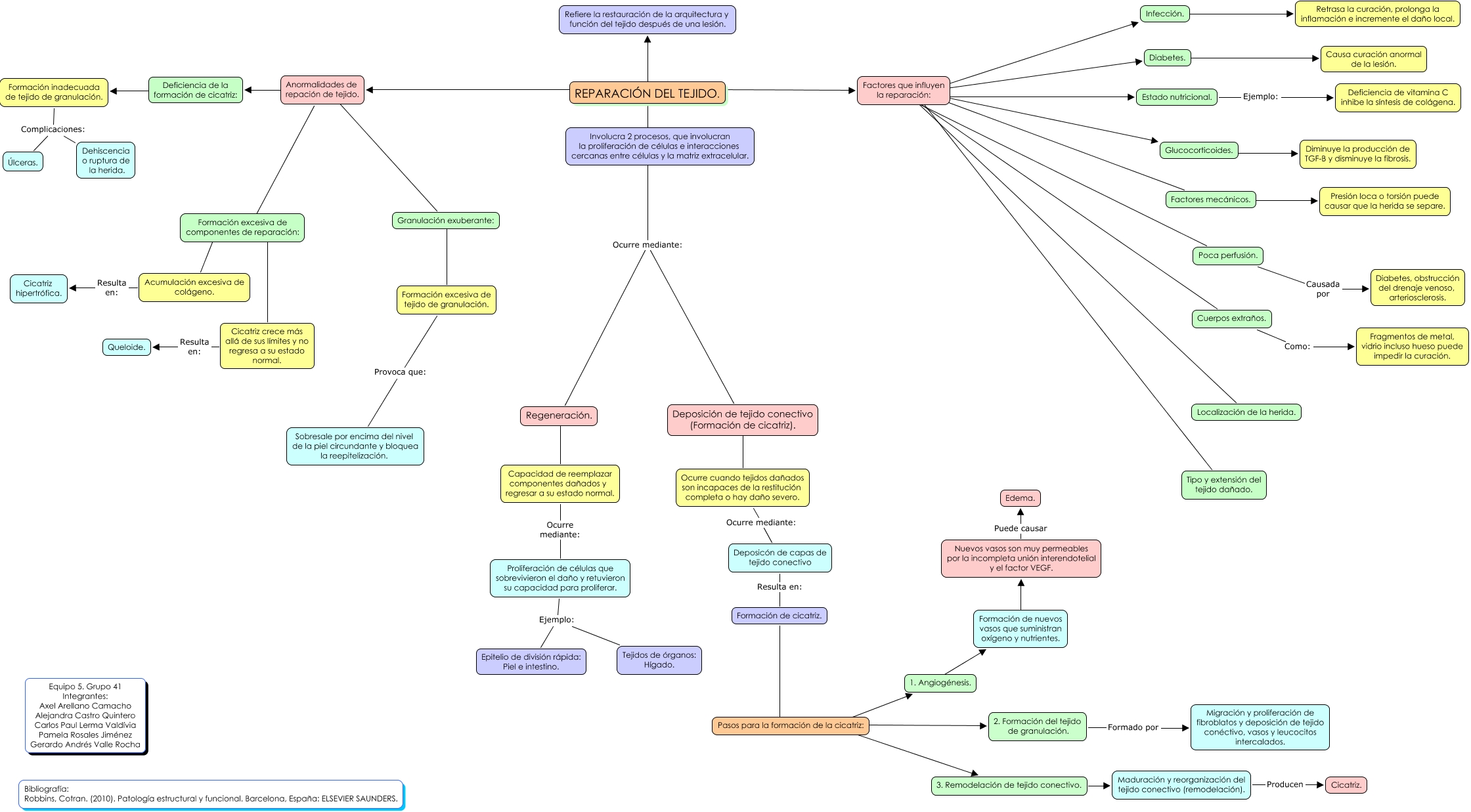Este Cmap, tiene información relacionada con: Patologia reparación, Deficiencia de la formación de cicatriz: ???? Formación inadecuada de tejido de granulación., Acumulación excesiva de colágeno. Resulta en: Cicatriz hipertrófica., REPARACIÓN DEL TEJIDO. ???? Factores que influyen la reparación:, Formación de cicatriz. ???? Pasos para la formación de la cicatriz:, Anormalidades de repación de tejido. ???? Granulación exuberante:, Formación de nuevos vasos que suministran oxígeno y nutrientes. ???? Nuevos vasos son muy permeables por la incompleta unión interendotelial y el factor VEGF., Regeneración. ???? Capacidad de reemplazar componentes dañados y regresar a su estado normal., Factores que influyen la reparación: ???? Diabetes., Factores mecánicos. ???? Presión loca o torsión puede causar que la herida se separe., Proliferación de células que sobrevivieron el daño y retuvieron su capacidad para proliferar. Ejemplo: Epitelio de división rápida: Piel e intestino., Factores que influyen la reparación: ???? Poca perfusión., Capacidad de reemplazar componentes dañados y regresar a su estado normal. Ocurre mediante: Proliferación de células que sobrevivieron el daño y retuvieron su capacidad para proliferar., Cicatriz crece más allá de sus límites y no regresa a su estado normal. Resulta en: Queloide., 3. Remodelación de tejido conectivo. ???? Maduración y reorganización del tejido conectivo (remodelación)., Glucocorticoides. ???? Diminuye la producción de TGF-B y disminuye la fibrosis., REPARACIÓN DEL TEJIDO. ???? Refiere la restauración de la arquitectura y función del tejido después de una lesión., Anormalidades de repación de tejido. ???? Formación excesiva de componentes de reparación:, Formación inadecuada de tejido de granulación. Complicaciones: Dehiscencia o ruptura de la herida., Factores que influyen la reparación: ???? Localización de la herida., Factores que influyen la reparación: ???? Tipo y extensión del tejido dañado.