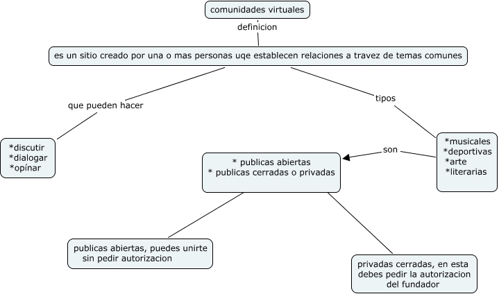 Este Cmap, tiene información relacionada con: comunidades virtuales, es un sitio creado por una o mas personas uqe establecen relaciones a travez de temas comunes tipos *musicales *deportivas *arte *literarias, es un sitio creado por una o mas personas uqe establecen relaciones a travez de temas comunes que pueden hacer *discutir *dialogar *opínar, comunidades virtuales definicion es un sitio creado por una o mas personas uqe establecen relaciones a travez de temas comunes, *musicales *deportivas *arte *literarias son * publicas abiertas * publicas cerradas o privadas, * publicas abiertas * publicas cerradas o privadas ???? privadas cerradas, en esta debes pedir la autorizacion del fundador, * publicas abiertas * publicas cerradas o privadas ???? publicas abiertas, puedes unirte sin pedir autorizacion