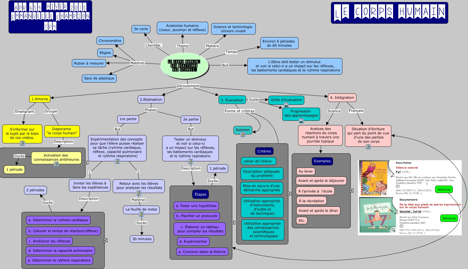 Cette carte de concepts créée avec IHMC CmapTools traite de: champion_emmanuelle_tp4, 1re partie But Expérimentation des concepts pour que l'élève puisse réaliser sa tâche (rythme cardiaque, réflexe, capacité pulmonaire et rythme respiratoire), Diaporama "le corps humain" Description Infos diaporama, 3. Évaluation Outils Grille d'évaluation, Amorce Étapes, Inviter les élèves à faire les expériences Description 5 expériences, 4. Intégration Français Situation d'écriture qui part du point de vue d'une des parties de son corps, Expérimentation des concepts pour que l'élève puisse réaliser sa tâche (rythme cardiaque, réflexe, capacité pulmonaire et rythme respiratoire) 2 Retour avec les élèves pour analyser les résultats, 4. Intégration Science Analyse des réactions du corps humain à travers une journée typique, 2.Réalisation Phases 2e partie, 1.Amorce Groupe Diaporama "le corps humain", Le corps humain; ses réactions aux stimuli. Déroulement 1.Amorce, Activation des connaissances antérieures Durée 1 période, 3. Évaluation Outils Progression des apprentissages, Étapes Durée 1 période, Analyse des réactions du corps humain à travers une journée typique Exemples, Le corps humain; ses réactions aux stimuli. Matériel Règles, Le corps humain; ses réactions aux stimuli. Thème Anatomie humaine (coeur, poumon et réflexe), Le corps humain; ses réactions aux stimuli. Matière Science et technologie Univers vivant, Le corps humain; ses réactions aux stimuli. Déroulement 3. Évaluation, Le corps humain; ses réactions aux stimuli. Déroulement 2.Réalisation