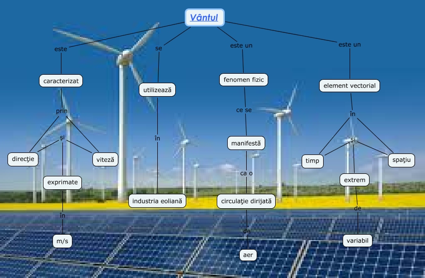 This Concept Map, created with IHMC CmapTools, has information related to: Vântul, manifestă ca o circulaţie dirijată, caracterizat prin direcţie, extrem de variabil, utilizează în industria eoliană, element vectorial în timp, fenomen fizic ce se manifestă, Vântul este caracterizat, direcţie şi exprimate, timp şi extrem, circulaţie dirijată de aer, caracterizat prin viteză, element vectorial în spaţiu, Vântul este un fenomen fizic, exprimate în m/s, Vântul este un element vectorial, Vântul se utilizează, direcţie şi viteză, timp şi spaţiu