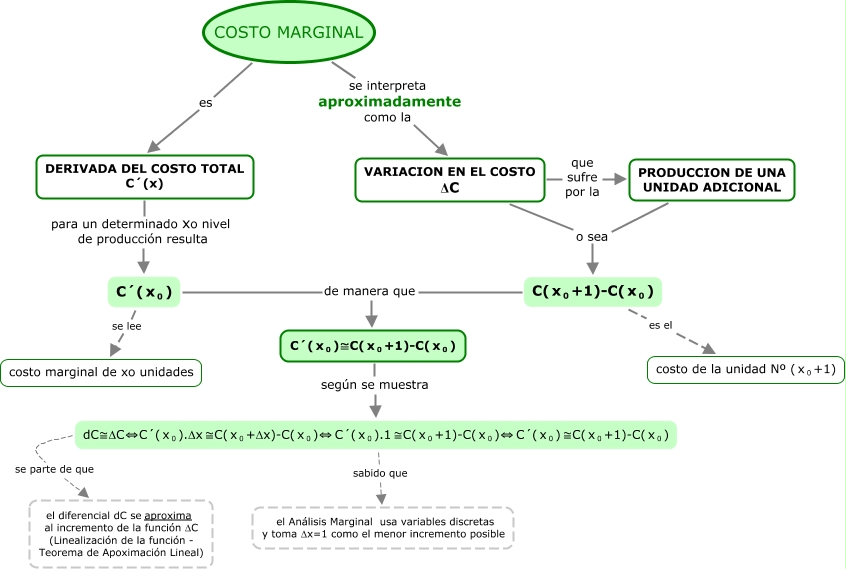 de producción resulta </mtext> </mrow> </math> <math xmlns="http://www.w3.org/1998/Math/MathML"> <mrow> <mtext> C´( </mtext> <mmultiscripts> <mtext> x </mtext> <mtext> 0 </mtext> <none/> </mmultiscripts> <mtext> ) </mtext> </mrow> </math>, PRODUCCION DE UNA UNIDAD ADICIONAL o sea <math xmlns="http://www.w3.org/1998/Math/MathML"> <mrow> <mtext> C( </mtext> <mmultiscripts> <mtext> x </mtext> <mtext> 0 </mtext> <none/> </mmultiscripts> <mtext> +1)-C( </mtext> <mmultiscripts> <mtext> x </mtext> <mtext> 0 </mtext> <none/> </mmultiscripts> <mtext> ) </mtext> </mrow> </math>, COSTO MARGINAL se interpreta aproximadamente como la VARIACION EN EL COSTO ΔC, <math xmlns="http://www.w3.org/1998/Math/MathML"> <mrow> <mtext> dC≅ΔC⇔C´( </mtext> <mmultiscripts> <mtext> x </mtext> <mtext> 0 </mtext> <none/> </mmultiscripts> <mtext> ).Δx </mtext> <mrow> <mtext> ≅C( </mtext> <mmultiscripts> <mtext> x </mtext> <mtext> 0 </mtext> <none/> </mmultiscripts> <mtext> +Δx)-C( </mtext> <mmultiscripts> <mtext> x </mtext> <mtext> 0 </mtext> <none/> </mmultiscripts> <mtext> )⇔ </mtext> <mrow> <mtext> C´( </mtext> <mmultiscripts> <mtext> x </mtext> <mtext> 0 </mtext> <none/> </mmultiscripts> <mtext> ).1 </mtext> <mrow> <mtext> ≅C( </mtext> <mmultiscripts> <mtext> x </mtext> <mtext> 0 </mtext> <none/> </mmultiscripts> <mtext> +1)-C( </mtext> <mmultiscripts> <mtext> x </mtext> <mtext> 0 </mtext> <none/> </mmultiscripts> <mtext> )⇔ </mtext> <mrow> <mtext> C´( </mtext> <mmultiscripts> <mtext> x </mtext> <mtext> 0 </mtext> <none/> </mmultiscripts> <mtext> ) </mtext> <mrow> <mtext> ≅C( </mtext> <mmultiscripts> <mtext> x </mtext> <mtext> 0 </mtext> <none/> </mmultiscripts> <mtext> +1)-C( </mtext> <mmultiscripts> <mtext> x </mtext> <mtext> 0 </mtext> <none/> </mmultiscripts> <mtext> ) </mtext> </mrow> </mrow> </mrow> </mrow> </mrow> </mrow> </math> se parte de que el diferencial dC se aproxima al incremento de la función ΔC (Linealización de la función - Teorema de Apoximación Lineal), <math xmlns="http://www.w3.org/1998/Math/MathML"> <mrow> <mtext> C´( </mtext> <mmultiscripts> <mtext> x </mtext> <mtext> 0 </mtext> <none/> </mmultiscripts> <mtext> )≅C( </mtext> <mmultiscripts> <mtext> x </mtext> <mtext> 0 </mtext> <none/> </mmultiscripts> <mtext> +1)-C( </mtext> <mmultiscripts> <mtext> x </mtext> <mtext> 0 </mtext> <none/> </mmultiscripts> <mtext> ) </mtext> </mrow> </math> según se muestra <math xmlns="http://www.w3.org/1998/Math/MathML"> <mrow> <mtext> dC≅ΔC⇔C´( </mtext> <mmultiscripts> <mtext> x </mtext> <mtext> 0 </mtext> <none/> </mmultiscripts> <mtext> ).Δx </mtext> <mrow> <mtext> ≅C( </mtext> <mmultiscripts> <mtext> x </mtext> <mtext> 0 </mtext> <none/> </mmultiscripts> <mtext> +Δx)-C( </mtext> <mmultiscripts> <mtext> x </mtext> <mtext> 0 </mtext> <none/> </mmultiscripts> <mtext> )⇔ </mtext> <mrow> <mtext> C´( </mtext> <mmultiscripts> <mtext> x </mtext> <mtext> 0 </mtext> <none/> </mmultiscripts> <mtext> ).1 </mtext> <mrow> <mtext> ≅C( </mtext> <mmultiscripts> <mtext> x </mtext> <mtext> 0 </mtext> <none/> </mmultiscripts> <mtext> +1)-C( </mtext> <mmultiscripts> <mtext> x </mtext> <mtext> 0 </mtext> <none/> </mmultiscripts> <mtext> )⇔ </mtext> <mrow> <mtext> C´( </mtext> <mmultiscripts> <mtext> x </mtext> <mtext> 0 </mtext> <none/> </mmultiscripts> <mtext> ) </mtext> <mrow> <mtext> ≅C( </mtext> <mmultiscripts> <mtext> x </mtext> <mtext> 0 </mtext> <none/> </mmultiscripts> <mtext> +1)-C( </mtext> <mmultiscripts> <mtext> x </mtext> <mtext> 0 </mtext> <none/> </mmultiscripts> <mtext> ) </mtext> </mrow> </mrow> </mrow> </mrow> </mrow> </mrow> </math>