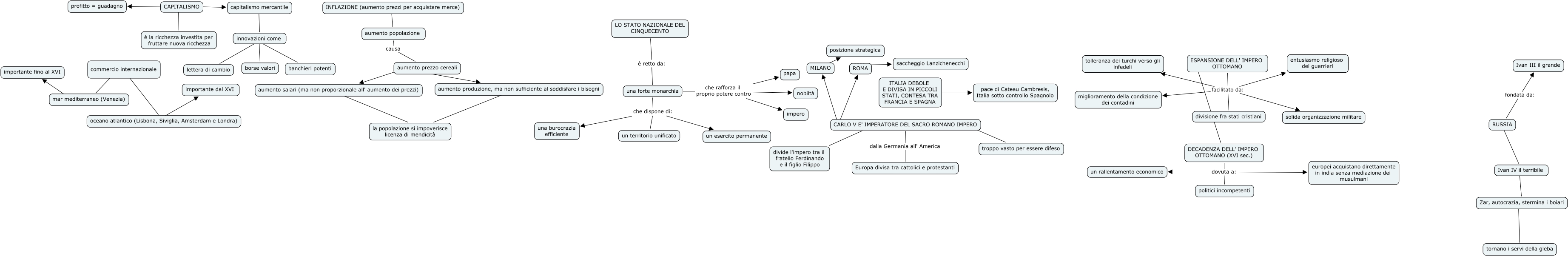Questa Cmap, creata con IHMC CmapTools, contiene informazioni relative a: schema 5, Zar, autocrazia, stermina i boiari ???? tornano i servi della gleba, commercio internazionale ???? mar mediterraneo (Venezia), DECADENZA DELL' IMPERO OTTOMANO (XVI sec.) dovuta a: europei acquistano direttamente in india senza mediazione dei musulmani, Ivan IV il terribile ???? Zar, autocrazia, stermina i boiari, ESPANSIONE DELL' IMPERO OTTOMANO facilitato da: entusiasmo religioso dei guerrieri, ESPANSIONE DELL' IMPERO OTTOMANO ???? DECADENZA DELL' IMPERO OTTOMANO (XVI sec.), ESPANSIONE DELL' IMPERO OTTOMANO facilitato da: miglioramento della condizione dei contadini, una forte monarchia che dispone di: un territorio unificato, capitalismo mercantile ???? innovazioni come, aumento salari (ma non proporzionale all' aumento dei prezzi) ???? la popolazione si impoverisce licenza di mendicità, una forte monarchia che rafforza il proprio potere contro impero, una forte monarchia che rafforza il proprio potere contro papa, ROMA ???? saccheggio Lanzichenecchi, una forte monarchia che dispone di: un esercito permanente, innovazioni come ???? borse valori, ITALIA DEBOLE E DIVISA IN PICCOLI STATI, CONTESA TRA FRANCIA E SPAGNA ???? pace di Cateau Cambresis, Italia sotto controllo Spagnolo, innovazioni come ???? lettera di cambio, DECADENZA DELL' IMPERO OTTOMANO (XVI sec.) dovuta a: politici incompetenti, commercio internazionale ???? oceano atlantico (Lisbona, Siviglia, Amsterdam e Londra), CAPITALISMO ???? profitto = guadagno