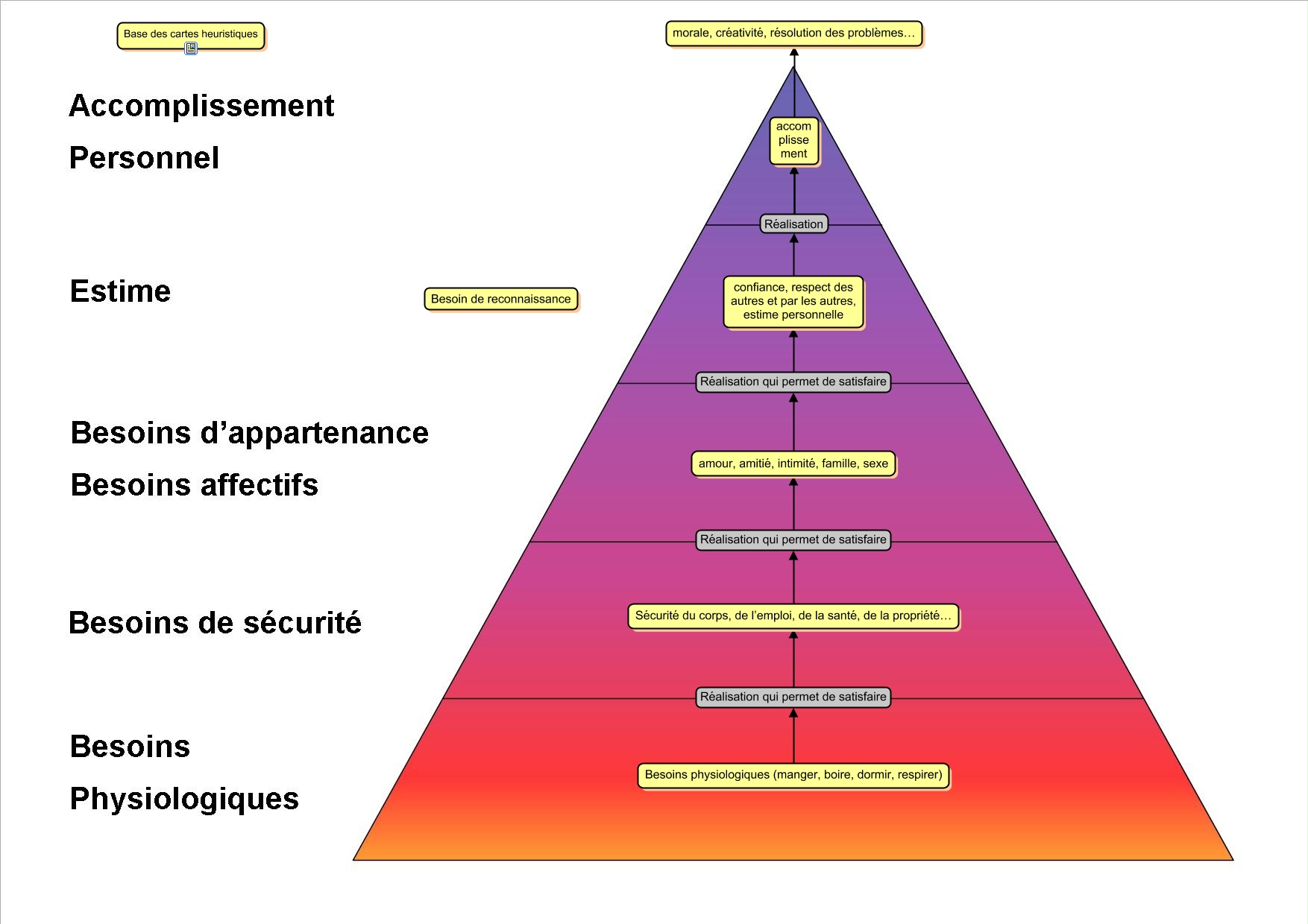 Cette carte de concepts créée avec IHMC CmapTools traite de: Besoins selon Maslow, Besoins physiologiques (manger, boire, dormir, respirer) Réalisation qui permet de satisfaire Sécurité du corps, de l’emploi, de la santé, de la propriété…, amour, amitié, intimité, famille, sexe Réalisation qui permet de satisfaire confiance, respect des autres et par les autres, estime personnelle, Sécurité du corps, de l’emploi, de la santé, de la propriété… Réalisation qui permet de satisfaire amour, amitié, intimité, famille, sexe, confiance, respect des autres et par les autres, estime personnelle Réalisation accom plisse ment, confiance, respect des autres et par les autres, estime personnelle Réalisation morale, créativité, résolution des problèmes…