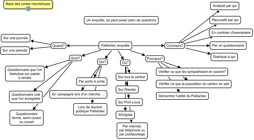Cette carte de concepts créée avec IHMC CmapTools traite de: Palliantec enquête, Palliantec enquête Quoi? Questionnaire que l'on distrubue sur papier à rendre, Palliantec enquête Pourquoi? Démontrer l'utilité de Palliantec, Palliantec enquête Qui? Par porte à porte, Palliantec enquête Pourquoi? Vérifier ce que les sympathisant en savent?, Palliantec enquête Quand? Sur une journée, Palliantec enquête Comment? Par un questionnaire, Palliantec enquête Qui? Lors de réunion publique Palliantec, Palliantec enquête Où? Par internet, par téléphone ou par publipostage, Palliantec enquête Comment? Distribué à qui, Palliantec enquête Où? Sur tout le canton, Palliantec enquête Qui? En campagne lors d'un marché, ..., Palliantec enquête Où? Al'hôpital, Palliantec enquête Comment? En combien d'exemplaire, Palliantec enquête Où? Sur Riantec, Palliantec enquête Pourquoi? Vérifier ce que la population du canton en sait, Palliantec enquête Quand? Sur une période, Palliantec enquête Comment? Reccueilli par qui, Palliantec enquête Où? Sur Port-Louis, Palliantec enquête Quoi? Questionnaire fermé, semi-ouvert ou ouvert, Palliantec enquête Quoi? Questionnaire oral que l'on enregistre
