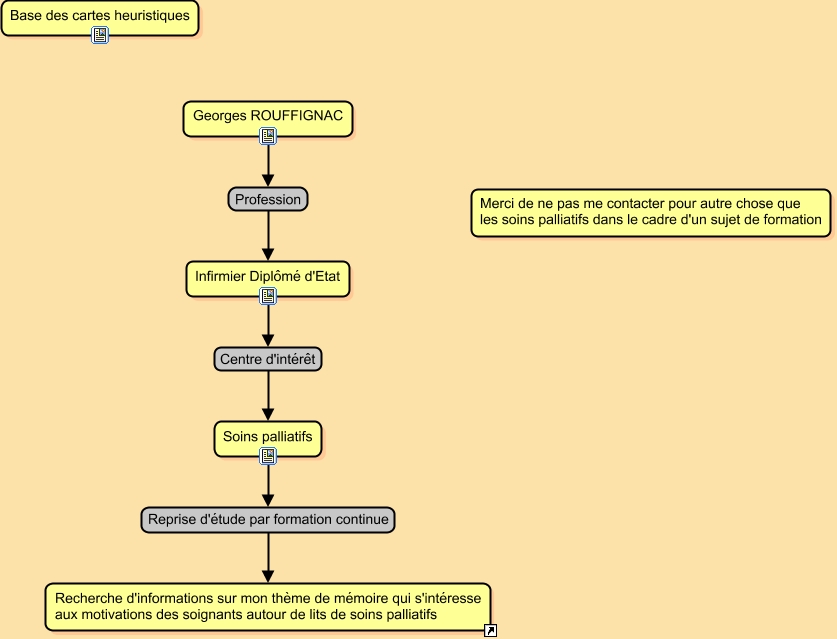 Cette carte de concepts créée avec IHMC CmapTools traite de: Attention_A_Lire_Attentivement, Infirmier Diplômé d'Etat Centre d'intérêt Soins palliatifs, Georges ROUFFIGNAC Profession Infirmier Diplômé d'Etat, Soins palliatifs Reprise d'étude par formation continue Recherche d'informations sur mon thème de mémoire qui s'intéresse aux motivations des soignants autour de lits de soins palliatifs