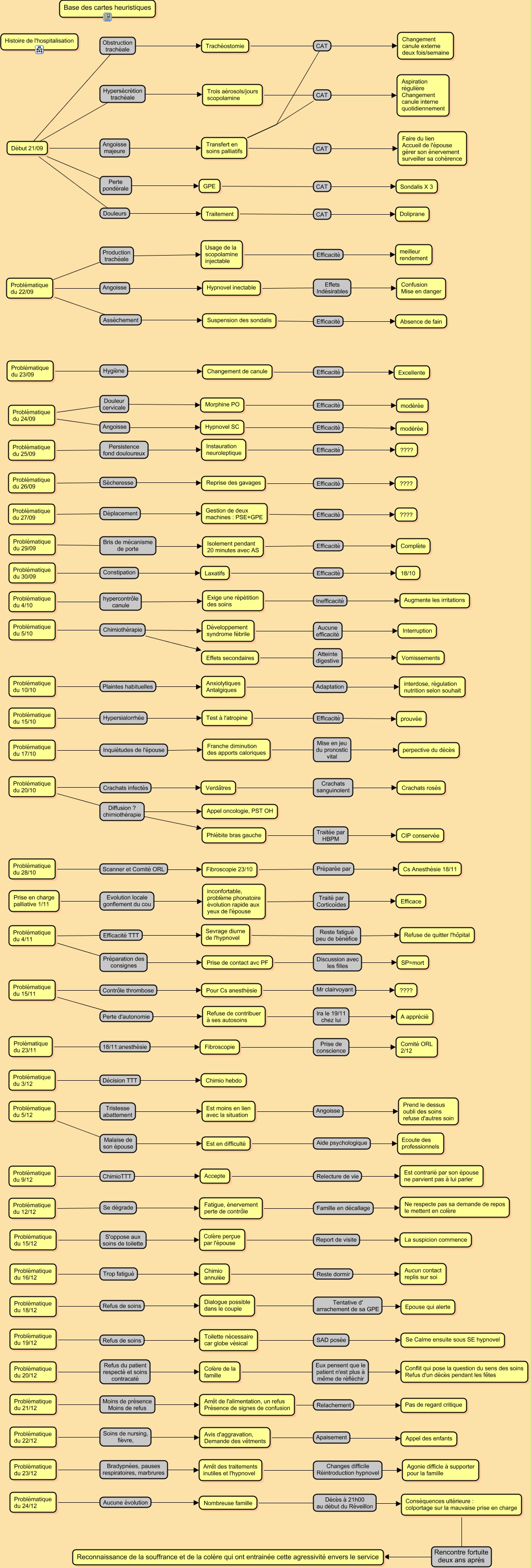 Cette carte de concepts créée avec IHMC CmapTools traite de: Histoire_Hosp_SP, Problématique du 22/09 Production trachéale Usage de la scopolamine injectable, Laxatifs Efficacité 18/10, Problématique du 24/09 Angoisse Hypnovel SC, Transfert en soins palliatifs CAT Changement canule externe deux fois/semaine, Problématique du 15/12 S'oppose aux soins de toilette Colère perçue par l'épouse, Est moins en lien avec la situation Angoisse Prend le dessus oubli des soins refuse d'autres soin, Début 21/09 Perte pondérale GPE, Arrêt des traitements inutiles et l'hypnovel Changes difficile Réintroduction hypnovel Agonie difficle à supporter pour la famille, Problématique du 30/09 Constipation Laxatifs, Colère perçue par l'épouse Report de visite La suspicion commence, Pour Cs anesthésie Mr clairvoyant ????, Problématique du 24/09 Douleur cervicale Morphine PO, Problématique du 16/12 Trop fatigué Chimio annulée, Début 21/09 Angoisse majeure Transfert en soins palliatifs, Problématique du 4/11 Efficacité TTT Sevrage diurne de l'hypnovel, Transfert en soins palliatifs CAT Faire du lien Accueil de l'épouse gérer son énervement surveiller sa cohérence, Début 21/09 Obstruction trachéale Trachéostomie, Instauration neuroleptique Efficacité ????, GPE CAT Sondalis X 3, Usage de la scopolamine injectable Efficacité meilleur rendement