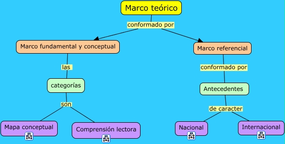 Este Cmap, tiene información relacionada con: Marco teórico, Marco fundamental y conceptual las categorías, Marco referencial conformado por Antecedentes, categorías son Mapa conceptual, categorías son Comprensión lectora, Antecedentes de caracter Internacional, Antecedentes de caracter Nacional, Marco teórico conformado por Marco fundamental y conceptual, Marco teórico conformado por Marco referencial