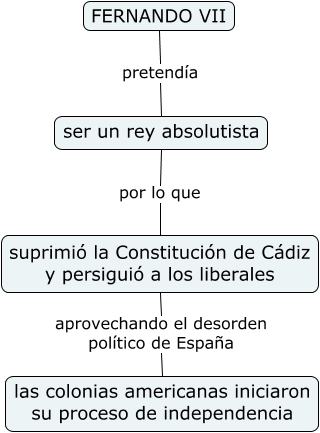 Este Cmap, tiene información relacionada con: Fernando VII, ser un rey absolutista por lo que suprimió la Constitución de Cádiz y persiguió a los liberales, suprimió la Constitución de Cádiz y persiguió a los liberales aprovechando el desorden político de España las colonias americanas iniciaron su proceso de independencia, FERNANDO VII pretendía ser un rey absolutista