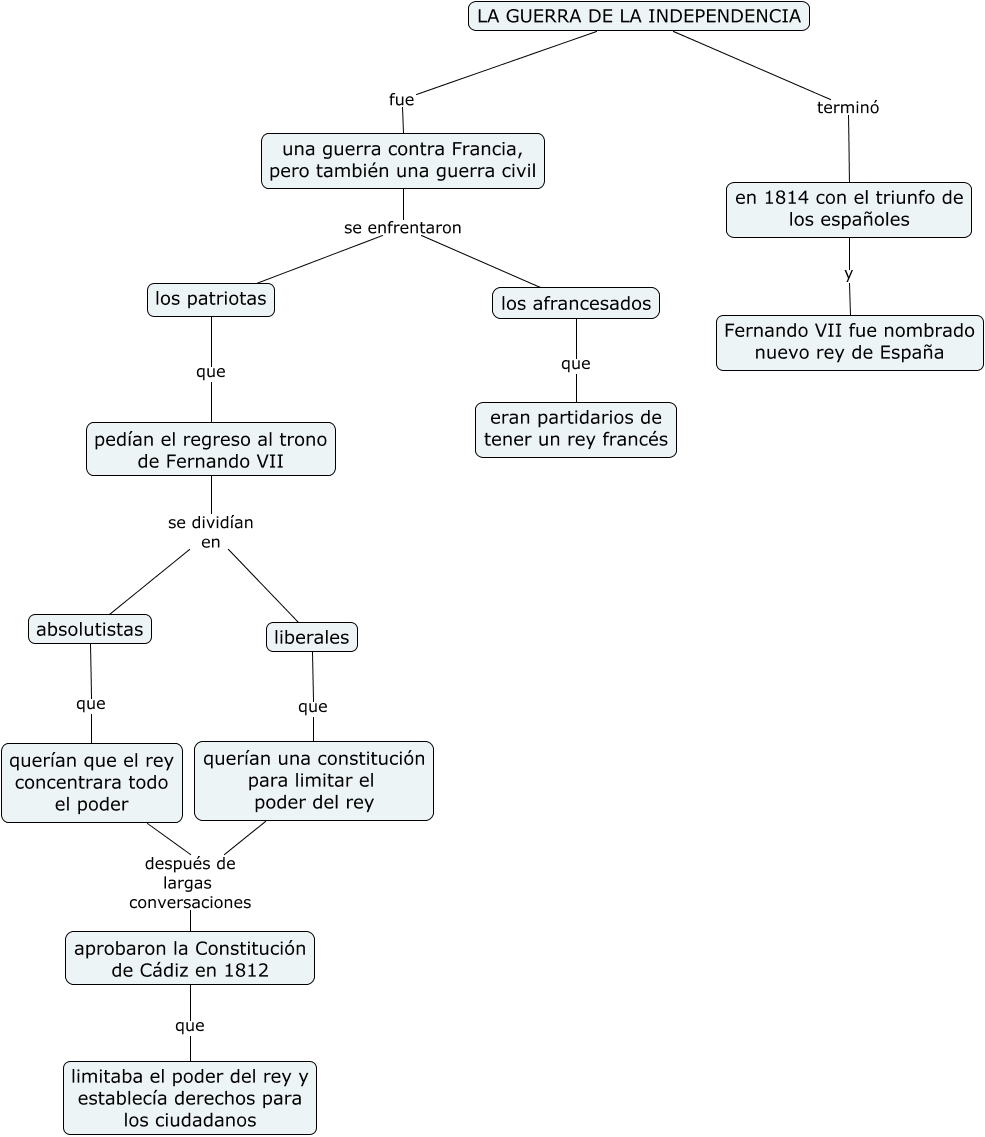 Este Cmap, tiene información relacionada con: La guerra de la independencia, LA GUERRA DE LA INDEPENDENCIA fue una guerra contra Francia, pero también una guerra civil, una guerra contra Francia, pero también una guerra civil se enfrentaron los afrancesados, pedían el regreso al trono de Fernando VII se dividían en liberales, querían una constitución para limitar el poder del rey después de largas conversaciones aprobaron la Constitución de Cádiz en 1812, aprobaron la Constitución de Cádiz en 1812 que limitaba el poder del rey y establecía derechos para los ciudadanos, una guerra contra Francia, pero también una guerra civil se enfrentaron los patriotas, los patriotas que pedían el regreso al trono de Fernando VII, pedían el regreso al trono de Fernando VII se dividían en absolutistas, absolutistas que querían que el rey concentrara todo el poder, los afrancesados que eran partidarios de tener un rey francés, querían que el rey concentrara todo el poder después de largas conversaciones aprobaron la Constitución de Cádiz en 1812, liberales que querían una constitución para limitar el poder del rey, LA GUERRA DE LA INDEPENDENCIA terminó en 1814 con el triunfo de los españoles, en 1814 con el triunfo de los españoles y Fernando VII fue nombrado nuevo rey de España