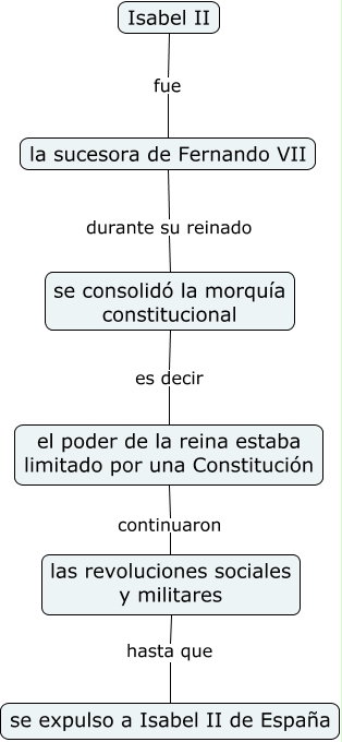 Este Cmap, tiene información relacionada con: Isabel II, Isabel II fue la sucesora de Fernando VII, el poder de la reina estaba limitado por una Constitución continuaron las revoluciones sociales y militares, las revoluciones sociales y militares hasta que se expulso a Isabel II de España, la sucesora de Fernando VII durante su reinado se consolidó la morquía constitucional, se consolidó la morquía constitucional es decir el poder de la reina estaba limitado por una Constitución