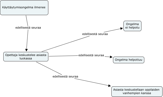 Tämä IHMC CmapToolsilla luotu käsitekartta sisältää tietoa, joka liittyy aiheeseen: Luokkatasoiseen käyttäytymisongelmaan puuttuminen, Opettaja keskustelee asiasta luokassa edellisestä seuraa Ongelma ei helpotu, Käyttäytymisongelma ilmenee edellisestä seuraa Opettaja keskustelee asiasta luokassa, Opettaja keskustelee asiasta luokassa edellisestä seuraa Asiasta keskustellaan oppilaiden vanhempien kanssa, Opettaja keskustelee asiasta luokassa edellisestä seuraa Ongelma helpottuu