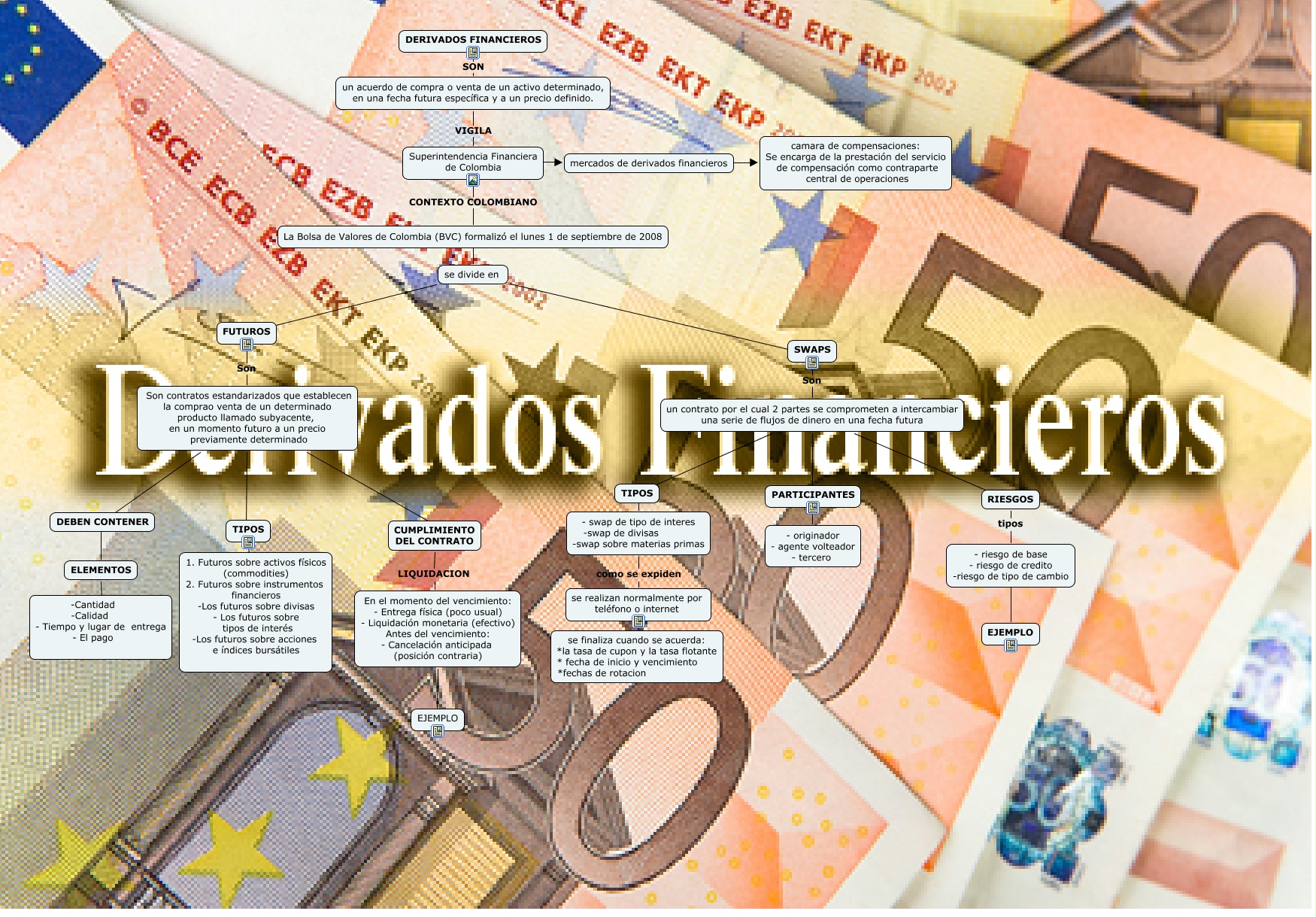 Este Cmap, tiene información relacionada con: DERIVADOS FINANCIEROS, Son contratos estandarizados que establecen la comprao venta de un determinado producto llamado subyacente, en un momento futuro a un precio previamente determinado ???? CUMPLIMIENTO DEL CONTRATO, DEBEN CONTENER ???? ELEMENTOS, ELEMENTOS ???? -Cantidad -Calidad - Tiempo y lugar de entrega - El pago, Son contratos estandarizados que establecen la comprao venta de un determinado producto llamado subyacente, en un momento futuro a un precio previamente determinado ???? TIPOS, RIESGOS tipos - riesgo de base - riesgo de credito -riesgo de tipo de cambio, Superintendencia Financiera de Colombia ???? mercados de derivados financieros, La Bolsa de Valores de Colombia (BVC) formalizó el lunes 1 de septiembre de 2008 ???? se divide en, DERIVADOS FINANCIEROS SON un acuerdo de compra o venta de un activo determinado, en una fecha futura específica y a un precio definido., - swap de tipo de interes -swap de divisas -swap sobre materias primas como se expiden se realizan normalmente por teléfono o internet, CUMPLIMIENTO DEL CONTRATO LIQUIDACION En el momento del vencimiento: - Entrega física (poco usual) - Liquidación monetaria (efectivo) Antes del vencimiento: - Cancelación anticipada (posición contraria), un acuerdo de compra o venta de un activo determinado, en una fecha futura específica y a un precio definido. VIGILA Superintendencia Financiera de Colombia, se divide en ???? SWAPS, En el momento del vencimiento: - Entrega física (poco usual) - Liquidación monetaria (efectivo) Antes del vencimiento: - Cancelación anticipada (posición contraria) ???? EJEMPLO, un contrato por el cual 2 partes se comprometen a intercambiar una serie de flujos de dinero en una fecha futura ???? RIESGOS, un contrato por el cual 2 partes se comprometen a intercambiar una serie de flujos de dinero en una fecha futura ???? PARTICIPANTES, - riesgo de base - riesgo de credito -riesgo de tipo de cambio ???? EJEMPLO, SWAPS Son un contrato por el cual 2 partes se comprometen a intercambiar una serie de flujos de dinero en una fecha futura, se divide en ???? FUTUROS, mercados de derivados financieros ???? camara de compensaciones: Se encarga de la prestación del servicio de compensación como contraparte central de operaciones, un contrato por el cual 2 partes se comprometen a intercambiar una serie de flujos de dinero en una fecha futura ???? TIPOS