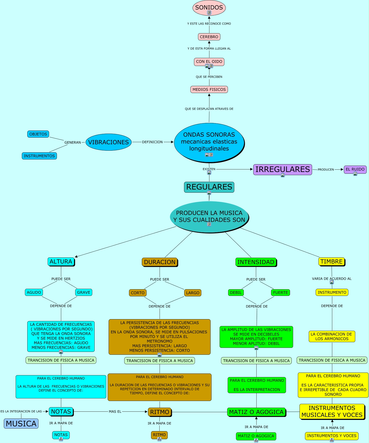 Este Cmap, tiene información relacionada con: MUSICA RAIZ, DEBIL DEPENDE DE LA AMPLITUD DE LAS VIBRACIONES SE MIDE EN DECIBELES MAYOR AMPLITUD: FUERTE MENOR APLITUD: DEBIL, ONDAS SONORAS mecanicas elasticas longitudinales EXISTEN REGULARES, CON EL OIDO Y DE ESTA FORMA LLEGAN AL CEREBRO, MATIZ O AGOGICA MAS LOS INSTRUMENTOS MUSICALES Y VOCES, MEDIOS FISICOS QUE SE PERCIBEN CON EL OIDO, PARA EL CEREBRO HUMANO LA ALTURA DE LAS FRECUENCIAS O VIBRACIONES DEFINE EL CONCEPTO DE: ???? NOTAS, ONDAS SONORAS mecanicas elasticas longitudinales QUE SE DESPLAZAN ATRAVES DE MEDIOS FISICOS, VIBRACIONES DEFINICION ONDAS SONORAS mecanicas elasticas longitudinales, REGULARES PRODUCEN LA MUSICA Y SUS CUALIDADES SON DURACION, REGULARES PRODUCEN LA MUSICA Y SUS CUALIDADES SON ALTURA, ONDAS SONORAS mecanicas elasticas longitudinales EXISTEN IRREGULARES, NOTAS IR A MAPA DE NOTAS, INTENSIDAD PUEDE SER DEBIL, REGULARES PRODUCEN LA MUSICA Y SUS CUALIDADES SON DURACION, LA AMPLITUD DE LAS VIBRACIONES SE MIDE EN DECIBELES MAYOR AMPLITUD: FUERTE MENOR APLITUD: DEBIL ???? MATIZ O AGOGICA, REGULARES PRODUCEN LA MUSICA Y SUS CUALIDADES SON DURACION, TRANCISION DE FISICA A MUSICA ???? LA CANTIDAD DE FRECUENCIAS ( VIBRACIONES POR SEGUNDO) QUE TENGA LA ONDA SONORA Y SE MIDE EN HERTZIOS MAS FRECUENCIAS: AGUDO MENOS FRECUENCIAS: GRAVE, ALTURA PUEDE SER AGUDO, REGULARES PRODUCEN LA MUSICA Y SUS CUALIDADES SON ALTURA, LA PERSISTENCIA DE LAS FRECUENCIAS (VIBRACIONES POR SEGUNDO) EN LA ONDA SONORA, SE MIDE EN PULSACIONES POR MINUTO Y SE UTILIZA EL METRONOMO MAS PERSISTENCIA: LARGO MENOS PERSISTENCIA: CORTO ???? PARA EL CEREBRO HUMANO LA DURACION DE LAS FRECUENCIAS O VIBRACIONES Y SU REPETICION EN DETERMINADO INTERVALO DE TIEMPO, DEFINE EL CONCEPTO DE: