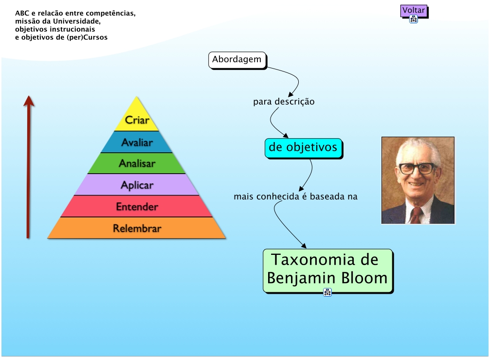 Esse mapa conceitual, produzido no IHMC CmapTools, tem a informação relacionada a: TaxonomiaBloom1, de objetivos mais conhecida é baseada na Taxonomia de Benjamin Bloom, Abordagem para descrição de objetivos