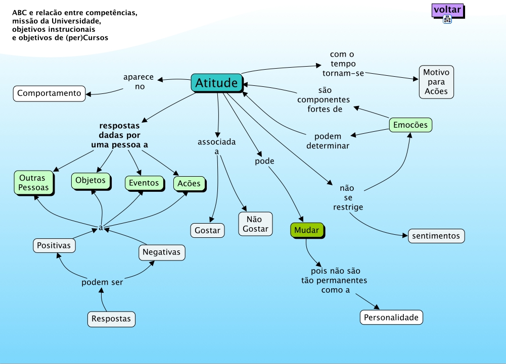 Esse mapa conceitual, produzido no IHMC CmapTools, tem a informação relacionada a: Atitude, Atitude respostas dadas por uma pessoa a Eventos, Atitude respostas dadas por uma pessoa a Objetos, Atitude não se restrige sentimentos, Negativas a Objetos, Respostas podem ser Negativas, Atitude com o tempo tornam-se Motivo para Acões, Atitude pode Mudar, Positivas a Objetos, Atitude respostas dadas por uma pessoa a Acões, Mudar pois não são tão permanentes como a Personalidade, Negativas a Eventos, Positivas a Acões, Negativas a Outras Pessoas, Atitude associada a Gostar, Atitude respostas dadas por uma pessoa a Outras Pessoas, Atitude aparece no Comportamento, Respostas podem ser Positivas, Positivas a Eventos, Positivas a Outras Pessoas, Negativas a Acões