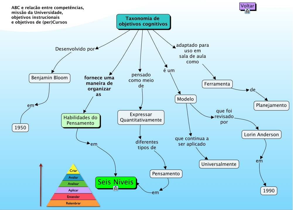 Esse mapa conceitual, produzido no IHMC CmapTools, tem a informação relacionada a: TaxionomiaBloom2, Taxonomia de objetivos cognitivos fornece uma maneira de organizar as Habilidades do Pensamento, Ferramenta de Planejamento, Benjamin Bloom em 1950, Expressar Quantitativamente diferentes tipos de Pensamento, Taxonomia de objetivos cognitivos é um Modelo, Habilidades do Pensamento em Seis Níveis, Taxonomia de objetivos cognitivos adaptado para uso em sala de aula como Ferramenta, Pensamento em Seis Níveis, Modelo que continua a ser aplicado Universalmente, Lorin Anderson em 1990, Modelo que foi revisado por Lorin Anderson, Taxonomia de objetivos cognitivos Desenvolvido por Benjamin Bloom, Taxonomia de objetivos cognitivos pensado como meio de Expressar Quantitativamente