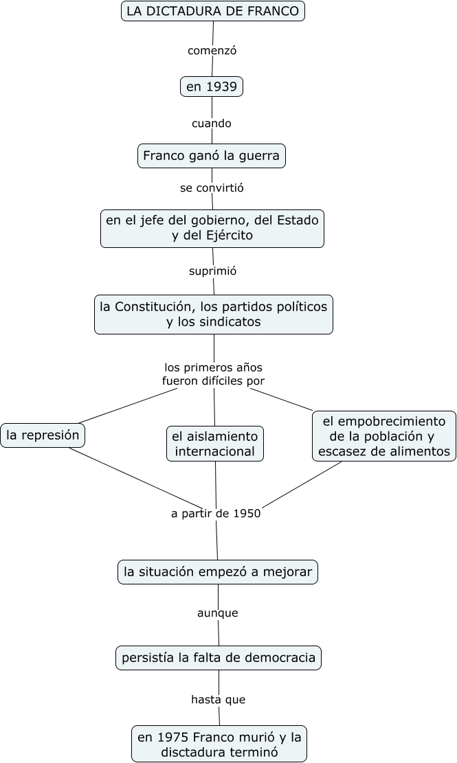 Este Cmap, tiene información relacionada con: La dictadura de Franco, en el jefe del gobierno, del Estado y del Ejército suprimió la Constitución, los partidos políticos y los sindicatos, en 1939 cuando Franco ganó la guerra, LA DICTADURA DE FRANCO comenzó en 1939, la Constitución, los partidos políticos y los sindicatos los primeros años fueron difíciles por el aislamiento internacional, el aislamiento internacional a partir de 1950 la situación empezó a mejorar, el empobrecimiento de la población y escasez de alimentos a partir de 1950 la situación empezó a mejorar, persistía la falta de democracia hasta que en 1975 Franco murió y la disctadura terminó, la Constitución, los partidos políticos y los sindicatos los primeros años fueron difíciles por la represión, la represión a partir de 1950 la situación empezó a mejorar, Franco ganó la guerra se convirtió en el jefe del gobierno, del Estado y del Ejército, la Constitución, los partidos políticos y los sindicatos los primeros años fueron difíciles por el empobrecimiento de la población y escasez de alimentos, la situación empezó a mejorar aunque persistía la falta de democracia