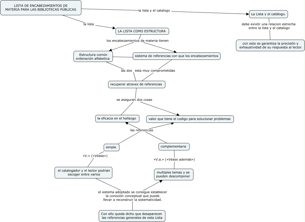 This Concept Map, created with IHMC CmapTools, has information related to: Normas para el uso de Encabezamientos - Grupo 5, simple las referencias complementaria, simple las referencias la eficacia en el hallazgo, Estructura común ordenación alfabetica las dos recuperar atravez de referencias, sistema de referencias con que los encabezamientos esta muy comprometidas recuperar atravez de referencias, el catalogador y el lector podrian escoger entre varios el sistema adoptado se consigue establecer la conexión conceptual que puede llevar a reconstruir la sistematicidad. multiples temas y se pueden descomponer, el catalogador y el lector podrian escoger entre varios el sistema adoptado se consigue establecer la conexión conceptual que puede llevar a reconstruir la sistematicidad. Con ello queda dicho que desaparecen las referencias generales de esta Lista, LA LISTA COMO ESTRUCTURA los encabezamientos de materia tienen sistema de referencias con que los encabezamientos, LISTA DE ENCABEZAMIENTOS DE MATERIA PARA LAS BIBLIOTECAS PÚBLICAS la lista y el catalogo La Lista y el catálogo., simple las referencias valor que tiene el codigo para solucionar problemas, simple «V.» («Véase») el catalogador y el lector podrian escoger entre varios, La Lista y el catálogo. debe exixtir una relacion estrecha entre la lista y el catalogo con esto se garantiza la precisión y exhaustividad de su respuesta al lector., LA LISTA COMO ESTRUCTURA los encabezamientos de materia tienen Estructura común ordenación alfabetica, recuperar atravez de referencias se aseguran dos cosas valor que tiene el codigo para solucionar problemas, Estructura común ordenación alfabetica ???? sistema de referencias con que los encabezamientos, LISTA DE ENCABEZAMIENTOS DE MATERIA PARA LAS BIBLIOTECAS PÚBLICAS la lista LA LISTA COMO ESTRUCTURA, recuperar atravez de referencias se aseguran dos cosas la eficacia en el hallazgo, complementaria «V.a.» («Véase además») multiples temas y se pueden descomponer