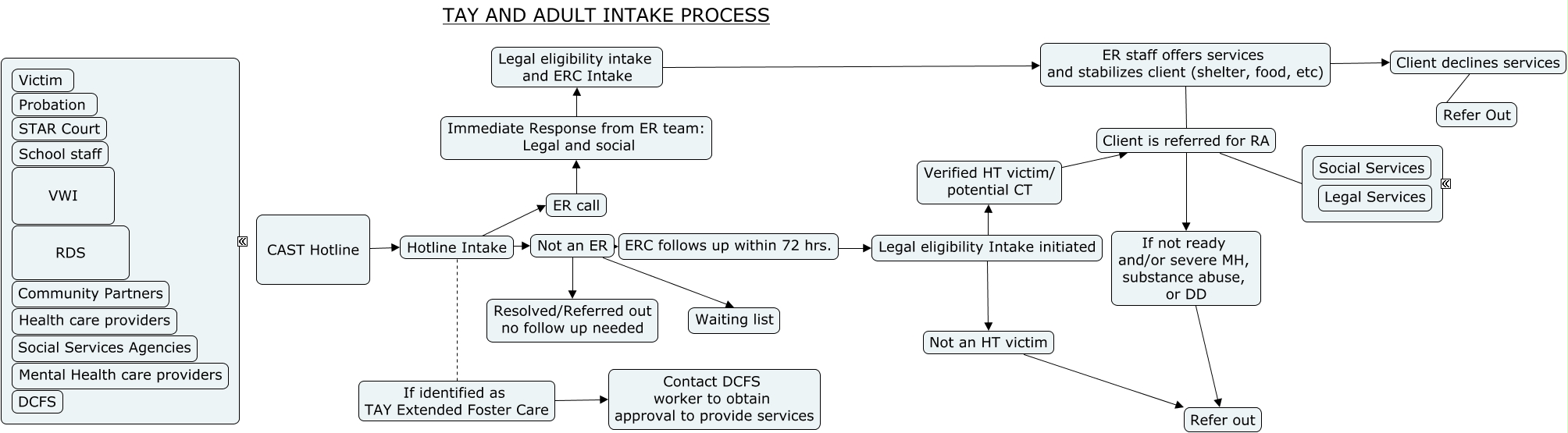 This Concept Map, created with IHMC CmapTools, has information related to: TAY Intake Process, Not an ER ERC follows up within 72 hrs., Not an ER Resolved/Referred out no follow up needed, Legal eligibility intake and ERC Intake ER staff offers services and stabilizes client (shelter, food, etc), Hotline Intake If identified as TAY Extended Foster Care, ER staff offers services and stabilizes client (shelter, food, etc) Client is referred for RA, ER call Immediate Response from ER team: Legal and social, Hotline Intake ER call, Verified HT victim/ potential CT Client is referred for RA, Legal eligibility Intake initiated Not an HT victim, Client declines services Refer Out, Client is referred for RA If not ready and/or severe MH, substance abuse, or DD, Not an ER Waiting list, If identified as TAY Extended Foster Care Contact DCFS worker to obtain approval to provide services, Legal eligibility Intake initiated Verified HT victim/ potential CT, Immediate Response from ER team: Legal and social Legal eligibility intake and ERC Intake, Not an HT victim Refer out, Client is referred for RA Open for Services at CAST, ER staff offers services and stabilizes client (shelter, food, etc) Client declines services, Hotline Intake Not an ER, If not ready and/or severe MH, substance abuse, or DD Refer out