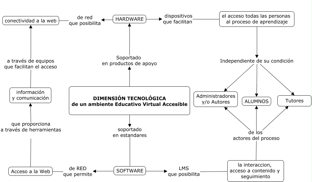 Este Cmap, tiene información relacionada con: DIMENSION TECNOLOGICA, Acceso a la Web que proporciona a través de herramientas información y comunicación, el acceso todas las personas al proceso de aprendizaje Independiente de su condición Tutores, la interaccion, acceso a contenido y seguimiento de los actores del proceso Tutores, SOFTWARE LMS que posibilita la interaccion, acceso a contenido y seguimiento, DIMENSIÓN TECNOLÓGICA de un ambiente Educativo Virtual Accesible soportado en estandares SOFTWARE, DIMENSIÓN TECNOLÓGICA de un ambiente Educativo Virtual Accesible Soportado en productos de apoyo HARDWARE, SOFTWARE de RED que permite Acceso a la Web, el acceso todas las personas al proceso de aprendizaje Independiente de su condición ALUMNOS, información y comunicación a través de equipos que facilitan el acceso conectividad a la web, HARDWARE de red que posibilita conectividad a la web, el acceso todas las personas al proceso de aprendizaje Independiente de su condición Administradores y/o Autores, la interaccion, acceso a contenido y seguimiento de los actores del proceso ALUMNOS, HARDWARE dispositivos que facilitan el acceso todas las personas al proceso de aprendizaje, la interaccion, acceso a contenido y seguimiento de los actores del proceso Administradores y/o Autores