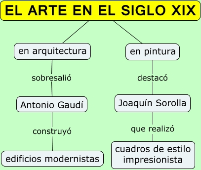 Este Cmap, tiene información relacionada con: El arte en el siglo XIX, Antonio Gaudí construyó edificios modernistas, EL ARTE EN EL SIGLO XIX en pintura, EL ARTE EN EL SIGLO XIX en arquitectura, en arquitectura sobresalió Antonio Gaudí, en pintura destacó Joaquín Sorolla, Joaquín Sorolla que realizó cuadros de estilo impresionista