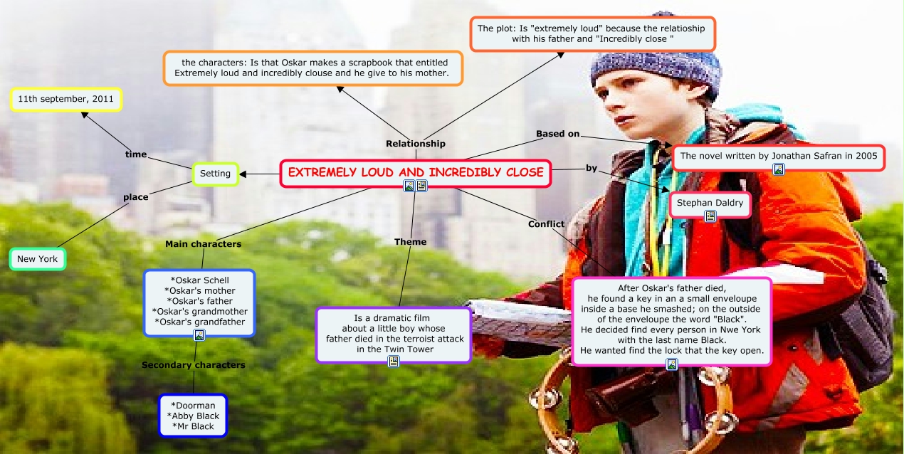 Este Cmap, tiene información relacionada con: Extremely loud and incredibly close, EXTREMELY LOUD AND INCREDIBLY CLOSE Based on The novel written by Jonathan Safran in 2005, EXTREMELY LOUD AND INCREDIBLY CLOSE Conflict After Oskar's father died, he found a key in an a small enveloupe inside a base he smashed; on the outside of the enveloupe the word "Black". He decided find every person in Nwe York with the last name Black. He wanted find the lock that the key open., EXTREMELY LOUD AND INCREDIBLY CLOSE Relationship the characters: Is that Oskar makes a scrapbook that entitled Extremely loud and incredibly clouse and he give to his mother., Setting time 11th september, 2011, Setting place New York, EXTREMELY LOUD AND INCREDIBLY CLOSE ???? Setting, EXTREMELY LOUD AND INCREDIBLY CLOSE by Stephan Daldry, EXTREMELY LOUD AND INCREDIBLY CLOSE Relationship The plot: Is "extremely loud" because the relatioship with his father and "Incredibly close ", EXTREMELY LOUD AND INCREDIBLY CLOSE Main characters *Oskar Schell *Oskar's mother *Oskar's father *Oskar's grandmother *Oskar's grandfather, *Oskar Schell *Oskar's mother *Oskar's father *Oskar's grandmother *Oskar's grandfather Secondary characters *Doorman *Abby Black *Mr Black, EXTREMELY LOUD AND INCREDIBLY CLOSE Theme Is a dramatic film about a little boy whose father died in the terroist attack in the Twin Tower