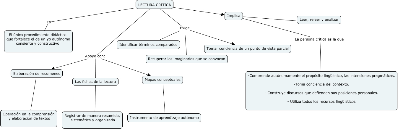 Este Cmap, tiene información relacionada con: Lectura Critica, Las fichas de la lectura ???? Registrar de manera resumida, sistemática y organizada, LECTURA CRÍTICA ???? Implica, Implica La persona crítica es la que -Comprende autónomamente el propósito lingüístico, las intenciones pragmáticas. -Toma conciencia del contexto. - Construye discursos que defienden sus posiciones personales. - Utiliza todos los recursos lingüísticos, LECTURA CRÍTICA Exige Tomar conciencia de un punto de vista parcial, LECTURA CRÍTICA Es El único procedimiento didáctico que fortalece el de un yo autónomo consiente y constructivo., LECTURA CRÍTICA Apoyo con: Mapas conceptuales, Mapas conceptuales ???? Instrumento de aprendizaje autónomo, Elaboración de resumenes ???? Operación en la comprensión y elaboración de textos, LECTURA CRÍTICA Apoyo con: Elaboración de resumenes, LECTURA CRÍTICA Exige Recuperar los imaginarios que se convocan, LECTURA CRÍTICA Exige Identificar términos comparados, Implica Leer, releer y analizar, LECTURA CRÍTICA Apoyo con: Las fichas de la lectura
