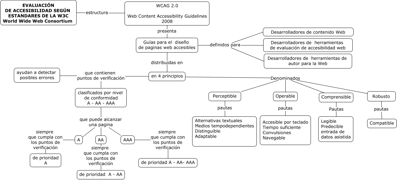 Este Cmap, tiene información relacionada con: EVALUAC. ACCESIBILIDAD, clasificados por nivel de conformidad A - AA - AAA que puede alcanzar una pagina A, AA siempre que cumpla con los puntos de verificación de prioridad A - AA, Guías para el diseño de paginas web accesibles definidos para Desarrolladores de herramientas de evaluación de accesibilidad web, A siempre que cumpla con los puntos de verificación de prioridad A, AAA siempre que cumpla con los puntos de verificación de prioridad A - AA- AAA, Robusto pautas Compatible, Operable pautas Accesible por teclado Tiempo suficiente Convulsiones Navegable, en 4 principios Denominados Perceptible, en 4 principios Denominados Comprensible, en 4 principios que contienen puntos de verificación clasificados por nivel de conformidad A - AA - AAA, en 4 principios Denominados Operable, en 4 principios Denominados Robusto, WCAG 2.0 Web Content Accessibility Guidelines 2008 presenta Guías para el diseño de paginas web accesibles, Guías para el diseño de paginas web accesibles distribuidas en en 4 principios, Guías para el diseño de paginas web accesibles definidos para Desarrolladores de herramientas de autor para la Web, clasificados por nivel de conformidad A - AA - AAA que puede alcanzar una pagina AA, clasificados por nivel de conformidad A - AA - AAA que puede alcanzar una pagina AAA, EVALUACIÓN DE ACCESIBILIDAD SEGÚN ESTANDARES DE LA W3C World Wide Web Consortium estructura WCAG 2.0 Web Content Accessibility Guidelines 2008, Comprensible Pautas Legible Predecible entrada de datos asistida, Guías para el diseño de paginas web accesibles definidos para Desarrolladores de contenido Web