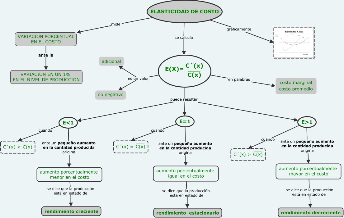 Este Cmap, tiene información relacionada con: ELASTICIDAD DE COSTO, <math xmlns="http://www.w3.org/1998/Math/MathML"> <mrow> <mtext> E(X)= </mtext> <mfrac> <mtext> C´(x) </mtext> <munderover> <mtext> C(x) </mtext> <none/> <mtext> _____ </mtext> </munderover> </mfrac> </mrow> </math> puede resultar E=1, <math xmlns="http://www.w3.org/1998/Math/MathML"> <mrow> <mtext> E(X)= </mtext> <mfrac> <mtext> C´(x) </mtext> <munderover> <mtext> C(x) </mtext> <none/> <mtext> _____ </mtext> </munderover> </mfrac> </mrow> </math> en palabras <math xmlns="http://www.w3.org/1998/Math/MathML"> <mrow> <mfrac> <mtext> costo marginal </mtext> <mtext> costo promedio </mtext> </mfrac> </mrow> </math>, Eɭ cuando <math xmlns="http://www.w3.org/1998/Math/MathML"> <mrow> <mtext> C´(x) > </mtext> <munderover> <mtext> C(x) </mtext> <none/> <mtext> _____ </mtext> </munderover> </mrow> </math>, aumento porcentualmente mayor en el costo se dice que la producción está en estado de rendimiento decreciente, aumento porcentualmente igual en el costo se dice que la producción está en estado de rendimiento estacionario, aumento porcentualmente menor en el costo se dice que la producción está en estado de rendimiento creciente, ELASTICIDAD DE COSTO mide VARIACION PORCENTUAL EN EL COSTO, E=1 ante un pequeño aumento en la cantidad producida origina aumento porcentualmente igual en el costo, <math xmlns="http://www.w3.org/1998/Math/MathML"> <mrow> <mtext> E(X)= </mtext> <mfrac> <mtext> C´(x) </mtext> <munderover> <mtext> C(x) </mtext> <none/> <mtext> _____ </mtext> </munderover> </mfrac> </mrow> </math> puede resultar Eɭ, ELASTICIDAD DE COSTO graficamente, Eə cuando <math xmlns="http://www.w3.org/1998/Math/MathML"> <mrow> <mtext> C´(x) < </mtext> <munderover> <mtext> C(x) </mtext> <none/> <mtext> _____ </mtext> </munderover> </mrow> </math>, Eɭ ante un pequeño aumento en la cantidad producida origina aumento porcentualmente mayor en el costo, <math xmlns="http://www.w3.org/1998/Math/MathML"> <mrow> <mtext> E(X)= </mtext> <mfrac> <mtext> C´(x) </mtext> <munderover> <mtext> C(x) </mtext> <none/> <mtext> _____ </mtext> </munderover> </mfrac> </mrow> </math> es un valor adicional, VARIACION PORCENTUAL EN EL COSTO ante la VARIACION EN UN 1% EN EL NIVEL DE PRODUCCION, <math xmlns="http://www.w3.org/1998/Math/MathML"> <mrow> <mtext> E(X)= </mtext> <mfrac> <mtext> C´(x) </mtext> <munderover> <mtext> C(x) </mtext> <none/> <mtext> _____ </mtext> </munderover> </mfrac> </mrow> </math> puede resultar Eə, Eə ante un pequeño aumento en la cantidad producida origina aumento porcentualmente menor en el costo, <math xmlns="http://www.w3.org/1998/Math/MathML"> <mrow> <mtext> E(X)= </mtext> <mfrac> <mtext> C´(x) </mtext> <munderover> <mtext> C(x) </mtext> <none/> <mtext> _____ </mtext> </munderover> </mfrac> </mrow> </math> es un valor no negativo, ELASTICIDAD DE COSTO se calcula <math xmlns="http://www.w3.org/1998/Math/MathML"> <mrow> <mtext> E(X)= </mtext> <mfrac> <mtext> C´(x) </mtext> <munderover> <mtext> C(x) </mtext> <none/> <mtext> _____ </mtext> </munderover> </mfrac> </mrow> </math>, E=1 cuando <math xmlns="http://www.w3.org/1998/Math/MathML"> <mrow> <mtext> C´(x) = </mtext> <munderover> <mtext> C(x) </mtext> <none/> <mtext> _____ </mtext> </munderover> </mrow> </math>