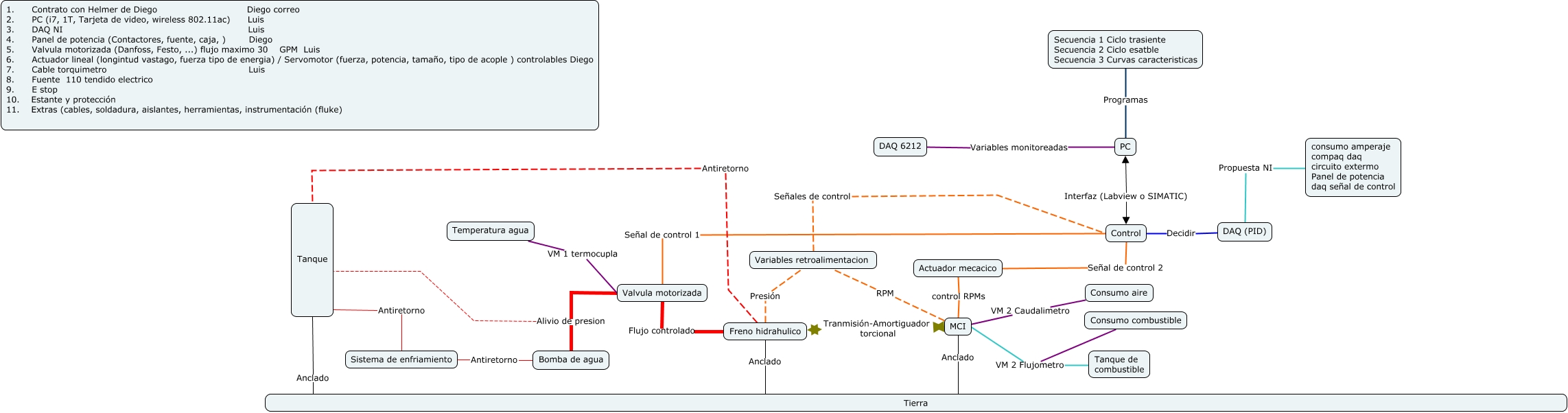 Este Cmap, tiene información relacionada con: Water brake engine, Valvula motorizada VM 1 termocupla Temperatura agua, Variables retroalimentacion Señales de control Control, PC Programas Secuencia 1 Ciclo trasiente Secuencia 2 Ciclo esatble Secuencia 3 Curvas caracteristicas, Freno hidrahulico Anclado Tierra, Freno hidrahulico Antiretorno Tanque, Tanque de combustible VM 2 Flujometro Consumo combustible, MCI Anclado Tierra, Tanque Anclado Tierra, Tanque Antiretorno Sistema de enfriamiento, Control Señal de control 2 Actuador mecacico, Tanque de combustible VM 2 Flujometro MCI, DAQ 6212 Variables monitoreadas PC, Bomba de agua Alivio de presion Tanque, MCI RPM Variables retroalimentacion, Valvula motorizada Flujo controlado Freno hidrahulico, Bomba de agua Alivio de presion Valvula motorizada, MCI VM 2 Caudalimetro Consumo aire, Actuador mecacico control RPMs MCI, Sistema de enfriamiento Antiretorno Bomba de agua, Valvula motorizada Señal de control 1 Control