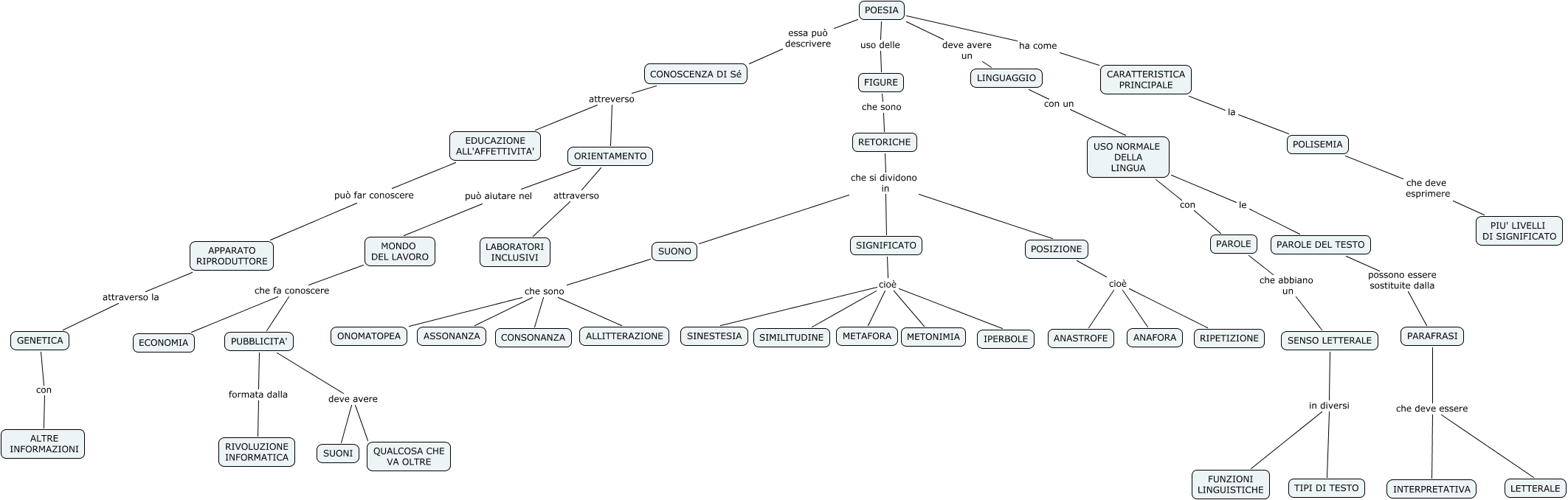 Questa Cmap, creata con IHMC CmapTools, contiene informazioni relative a: POESIA_PIU_OMED, SUONO che sono CONSONANZA, POSIZIONE cioè ANAFORA, POESIA deve avere un LINGUAGGIO, RETORICHE che si dividono in SUONO, POLISEMIA che deve esprimere PIU' LIVELLI DI SIGNIFICATO, USO NORMALE DELLA LINGUA le PAROLE DEL TESTO, SIGNIFICATO cioè METONIMIA, POESIA ha come CARATTERISTICA PRINCIPALE, POESIA essa può descrivere CONOSCENZA DI Sé, CONOSCENZA DI Sé attreverso EDUCAZIONE ALL'AFFETTIVITA', SIGNIFICATO cioè SIMILITUDINE, CARATTERISTICA PRINCIPALE la POLISEMIA, RETORICHE che si dividono in SIGNIFICATO, PAROLE DEL TESTO possono essere sostituite dalla PARAFRASI, PARAFRASI che deve essere LETTERALE, SIGNIFICATO cioè METAFORA, PARAFRASI che deve essere INTERPRETATIVA, USO NORMALE DELLA LINGUA con PAROLE, RETORICHE che si dividono in POSIZIONE, FIGURE che sono RETORICHE