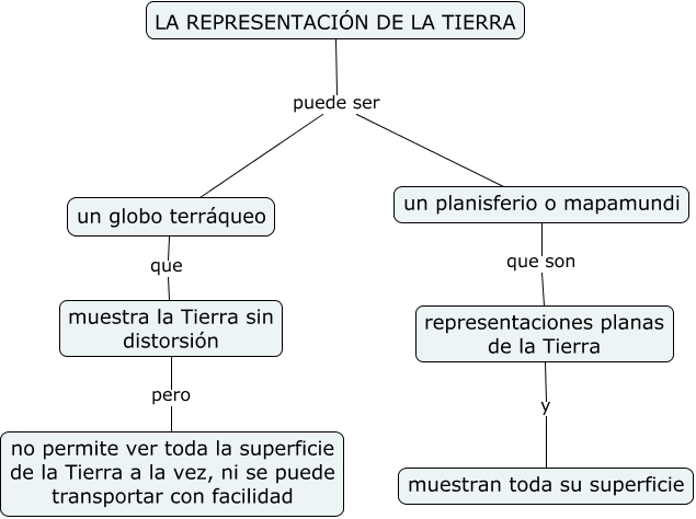 Este Cmap, tiene información relacionada con: La representación de la Tierra, LA REPRESENTACIÓN DE LA TIERRA puede ser un globo terráqueo, un globo terráqueo que muestra la Tierra sin distorsión, LA REPRESENTACIÓN DE LA TIERRA puede ser un planisferio o mapamundi, representaciones planas de la Tierra y muestran toda su superficie, un planisferio o mapamundi que son representaciones planas de la Tierra, muestra la Tierra sin distorsión pero no permite ver toda la superficie de la Tierra a la vez, ni se puede transportar con facilidad