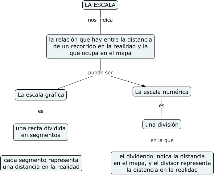 Este Cmap, tiene información relacionada con: La escala, LA ESCALA nos indica la relación que hay entre la distancia de un recorrido en la realidad y la que ocupa en el mapa, una división en la que el dividendo indica la distancia en el mapa, y el divisor representa la distancia en la realidad, la relación que hay entre la distancia de un recorrido en la realidad y la que ocupa en el mapa puede ser La escala numérica, una recta dividida en segmentos cada segmento representa una distancia en la realidad, La escala numérica es una división, La escala gráfica es una recta dividida en segmentos, la relación que hay entre la distancia de un recorrido en la realidad y la que ocupa en el mapa puede ser La escala gráfica