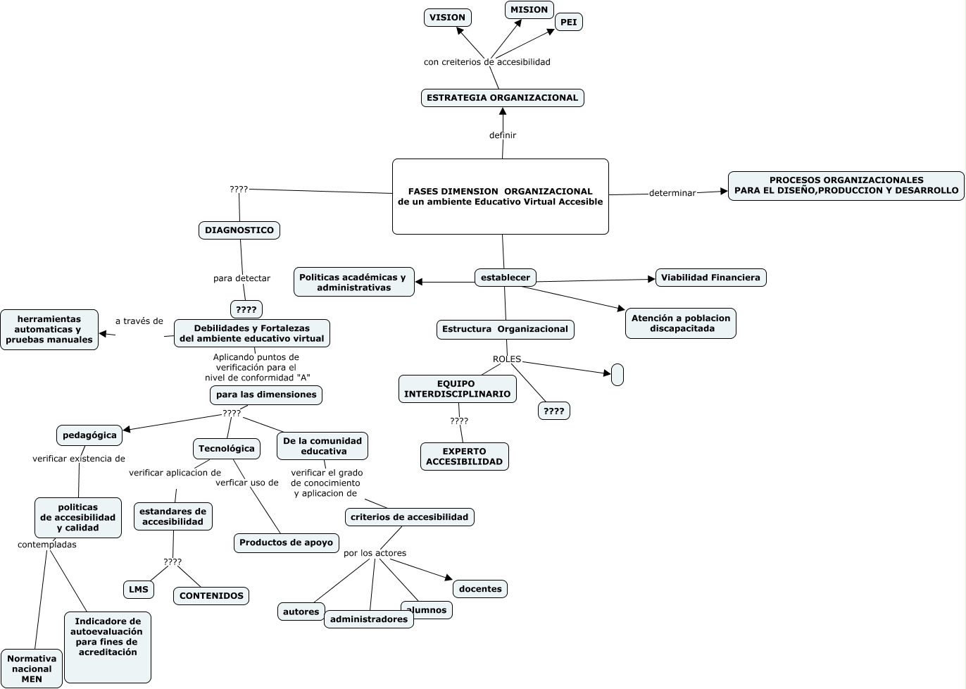 Este Cmap, tiene información relacionada con: METODOLOGIADIMENSION ORGANIZACIONAL vr. 2, criterios de accesibilidad por los actores administradores, FASES DIMENSION ORGANIZACIONAL de un ambiente Educativo Virtual Accesible ???? Atención a poblacion discapacitada, criterios de accesibilidad por los actores docentes, Estructura Organizacional ROLES ????, Debilidades y Fortalezas del ambiente educativo virtual a través de herramientas automaticas y pruebas manuales, Tecnológica verificar aplicacion de estandares de accesibilidad, Tecnológica verficar uso de Productos de apoyo, para las dimensiones ???? pedagógica, criterios de accesibilidad por los actores alumnos, politicas de accesibilidad y calidad contempladas Indicadore de autoevaluación para fines de acreditación, estandares de accesibilidad ???? CONTENIDOS, Estructura Organizacional ROLES, FASES DIMENSION ORGANIZACIONAL de un ambiente Educativo Virtual Accesible ???? Viabilidad Financiera, criterios de accesibilidad por los actores autores, pedagógica verificar existencia de politicas de accesibilidad y calidad, para las dimensiones ???? Tecnológica, FASES DIMENSION ORGANIZACIONAL de un ambiente Educativo Virtual Accesible ???? Estructura Organizacional, Debilidades y Fortalezas del ambiente educativo virtual Aplicando puntos de verificación para el nivel de conformidad "A" para las dimensiones, Estructura Organizacional ROLES EQUIPO INTERDISCIPLINARIO, FASES DIMENSION ORGANIZACIONAL de un ambiente Educativo Virtual Accesible definir ESTRATEGIA ORGANIZACIONAL