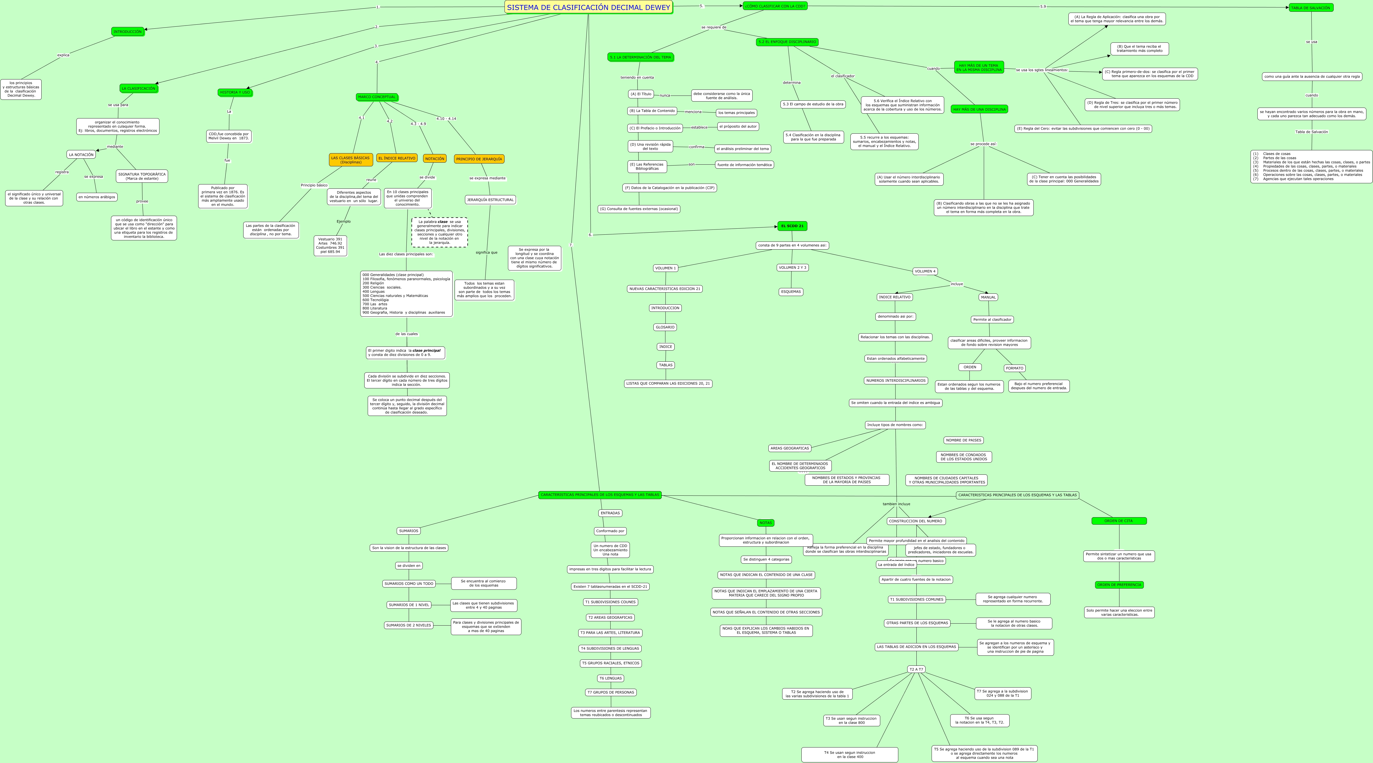 Este Cmap, tiene información relacionada con: Romilda_Lozano_yeni_Rubiano_Zayra_Polentino_T1_SCDD_G09, CDD,fue concebida por Melvil Dewey en 1873. fue Publicado por primera vez en 1876. Es el sistema de clasificación más ampliamente usado en el mundo., LA NOTACIÓN se expresa en números arábigos, SIGNATURA TOPOGRÁFICA (Marca de estante) provee un código de identificación único que se usa como "dirección" para ubicar el libro en el estante y como una etiqueta para los registros de inventario la biblioteca., INDICE ???? TABLAS, SISTEMA DE CLASIFICACIÓN DECIMAL DEWEY 7. CARACTERISTICAS PRINCIPALES DE LOS ESQUEMAS Y LAS TABLAS, SISTEMA DE CLASIFICACIÓN DECIMAL DEWEY 4. MARCO CONCEPTUAL, 5.2 EL ENFOQUE DISCIPLINARIO el clasificador 5.5 recurre a los esquemas: sumarios, encabezamientos y notas, el manual y el Índice Relativo., INTRODUCCIÓN explica los principios y estructuras básicas de la clasificación Decimal Dewey., T2 A T7 ???? T7 Se agrega a la subdivision 024 y 088 de la T1, HAY MÁS DE UN TEMA EN LA MISMA DISCIPLINA se usa los sgtes lineamientos: (E) Regla del Cero: evitar las subdivisiones que comiencen con cero (0 - 00), consta de 9 partes en 4 volumenes asi: ???? EL SCDD 21, consta de 9 partes en 4 volumenes asi: ???? VOLUMEN 2 Y 3, LAS TABLAS DE ADICION EN LOS ESQUEMAS ???? Se agregan a los numeros de esquema y se identifican por un asterisco y una instruccion de pie de pagina, EL ÍNDICE RELATIVO reune Diferentes aspectos de la disciplina,del tema del vestuario en un sólo lugar., T2 A T7 ???? T6 Se usa segun la notacion en la T4, T3, T2., 5.1 LA DETERMINACIÓN DEL TEMA teniendo en cuenta (G) Consulta de fuentes externas (ocasional), NOTAS ???? ????, VOLUMEN 1 ???? INTRODUCCION, LA CLASIFICACIÓN se usa para organizar el conocimiento representado en culaquier forma. Ej: libros, documentos, registros electrónicos, CONSTRUCCION DEL NUMERO ???? T2 A T7